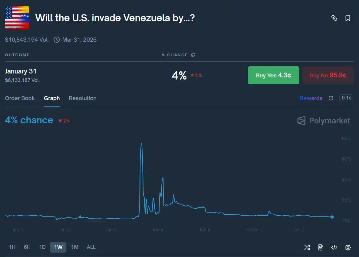 Even after Trump brazenly stated "run Venezuela" following the attack, as of the time of this writing, the market has still not been resolved, and the probability has fallen back to 4%.
