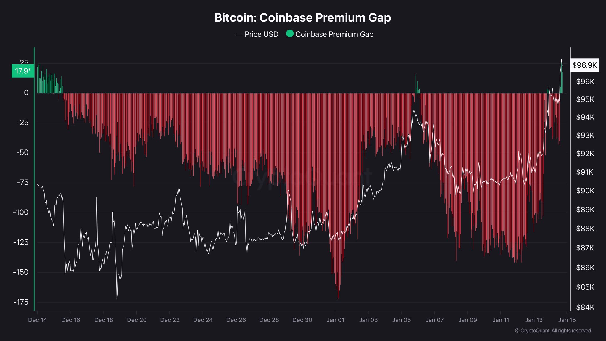For now, though, the surge into the positive region is still brief, so it only remains to be seen whether the American investors will continue to back the bullish price action in the coming days. Earlier this month, a similar trend developed when Bitcoin saw a rally above $94,000. The Coinbase Premium Gap took a green shade late in that surge, but what followed was a plunge back into the negative zone and a fizzling out for the price rally.
