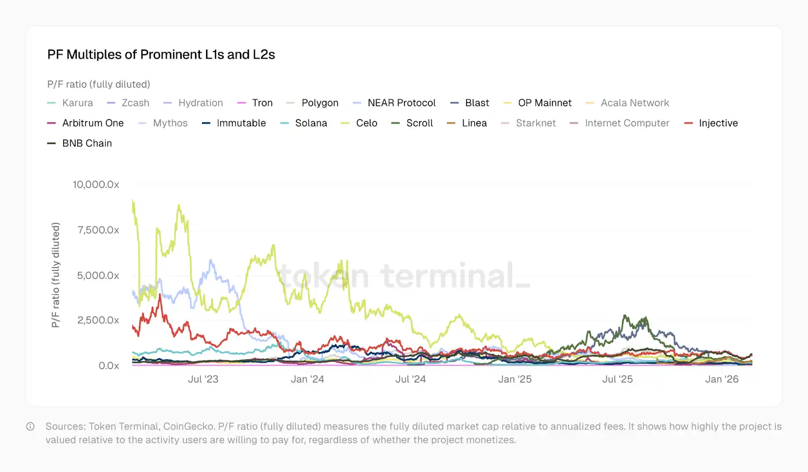In other words, the market values them below the fees they generate in a year. A strange paradox emerges: although the valuations of underlying protocols (whether DeFi or L1 itself) are trending downward, applications built on these protocols are generating higher revenue in a shorter time.