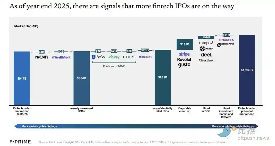 Private transactions aside, IPOs did see a significant rebound in 2025. Eleven VC-backed fintech companies, including Circle and Klarna, have gone public, with more on the way. Kraken and Bitgo have filed confidentially, while companies like Ramp and Gusto are preparing by cleaning up cap tables, hiring new CFOs, or engaging investment banks. F-Prime estimates the total market cap of fintech could grow from $947 billion to $1.2 trillion.