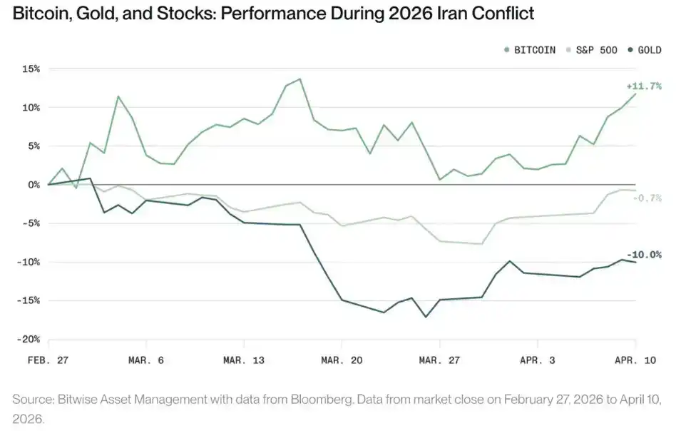 Bitcoin has performed relatively strongly since the outbreak of the Iran conflict. Since the U.S. and Israel began airstrikes against Iran on February 28, Bitcoin has risen by 12%, while the S&P 500 index has fallen by 1%, and gold has dropped by 10%.