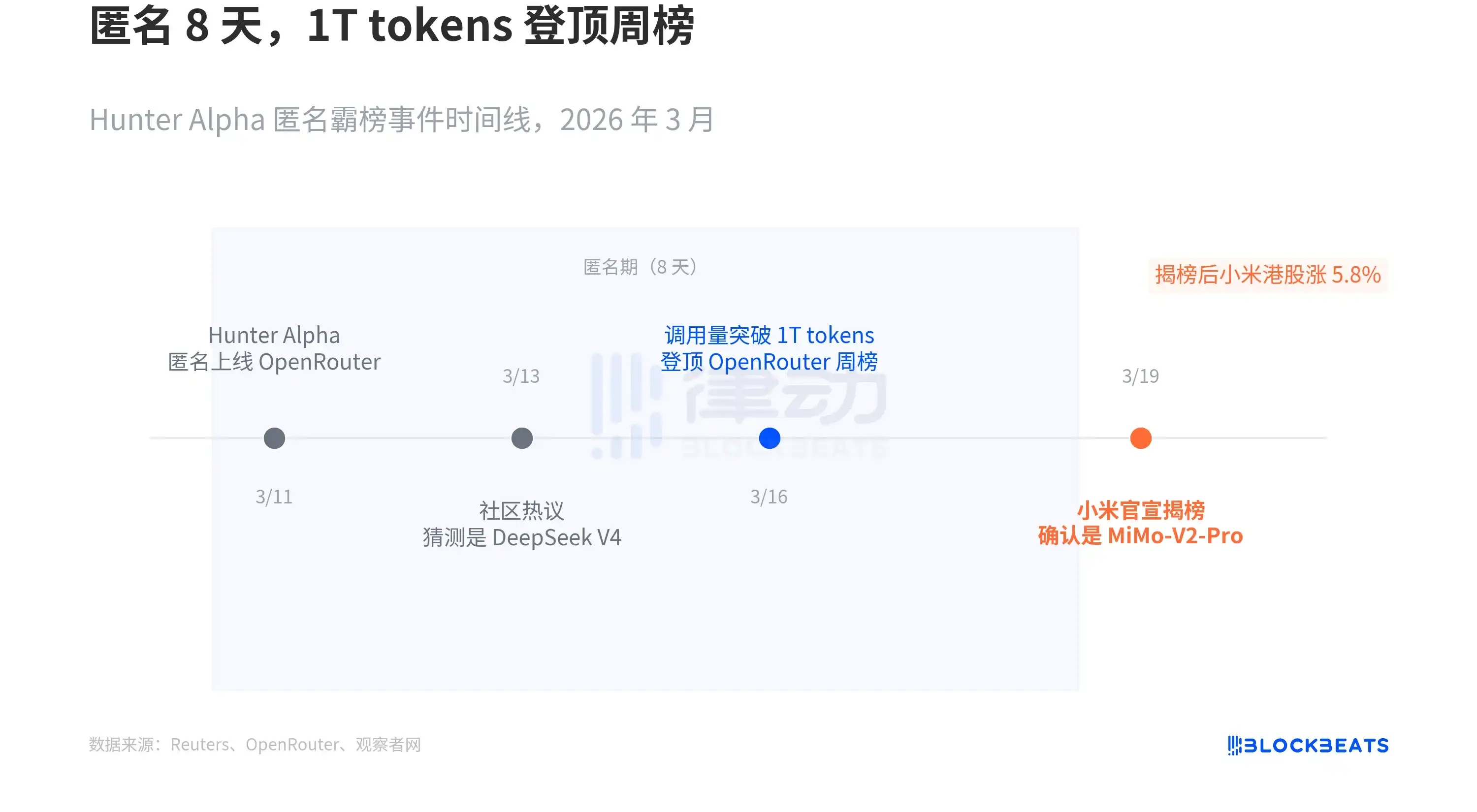 In the early hours of March 19, Xiaomi revealed the answer: Hunter Alpha was MiMo-V2-Pro. According to the same Reuters report, Xiaomi's Hong Kong stock saw a gain of up to 5.8% after the reveal.