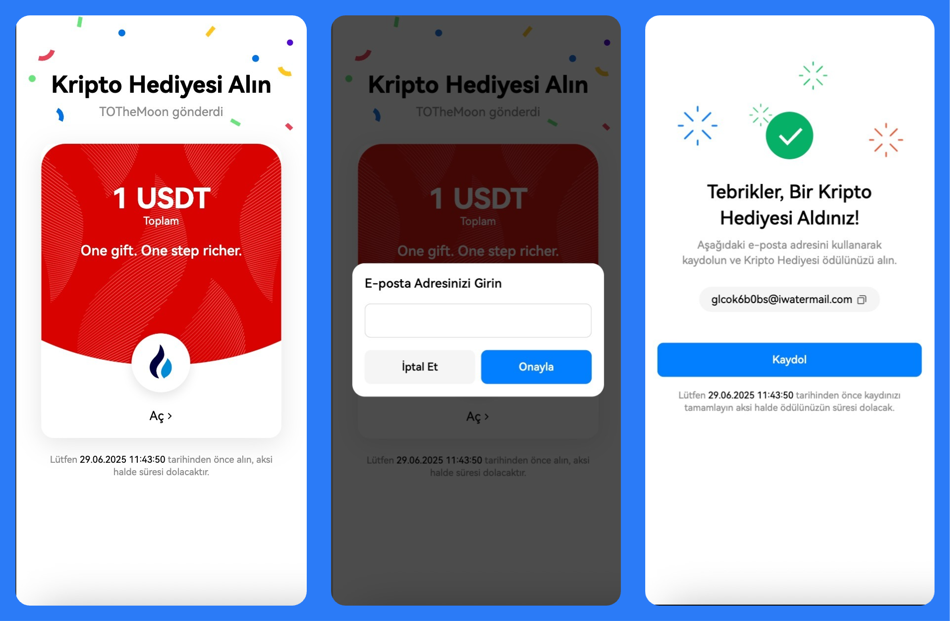 Aldığınız Kripto Hediyesi bağlantısına dokunun, e-posta adresinizi girin ve onaylayın. E-postanız doğrulandıktan sonra, Kripto Hediyesi başarıyla alıncaktır.