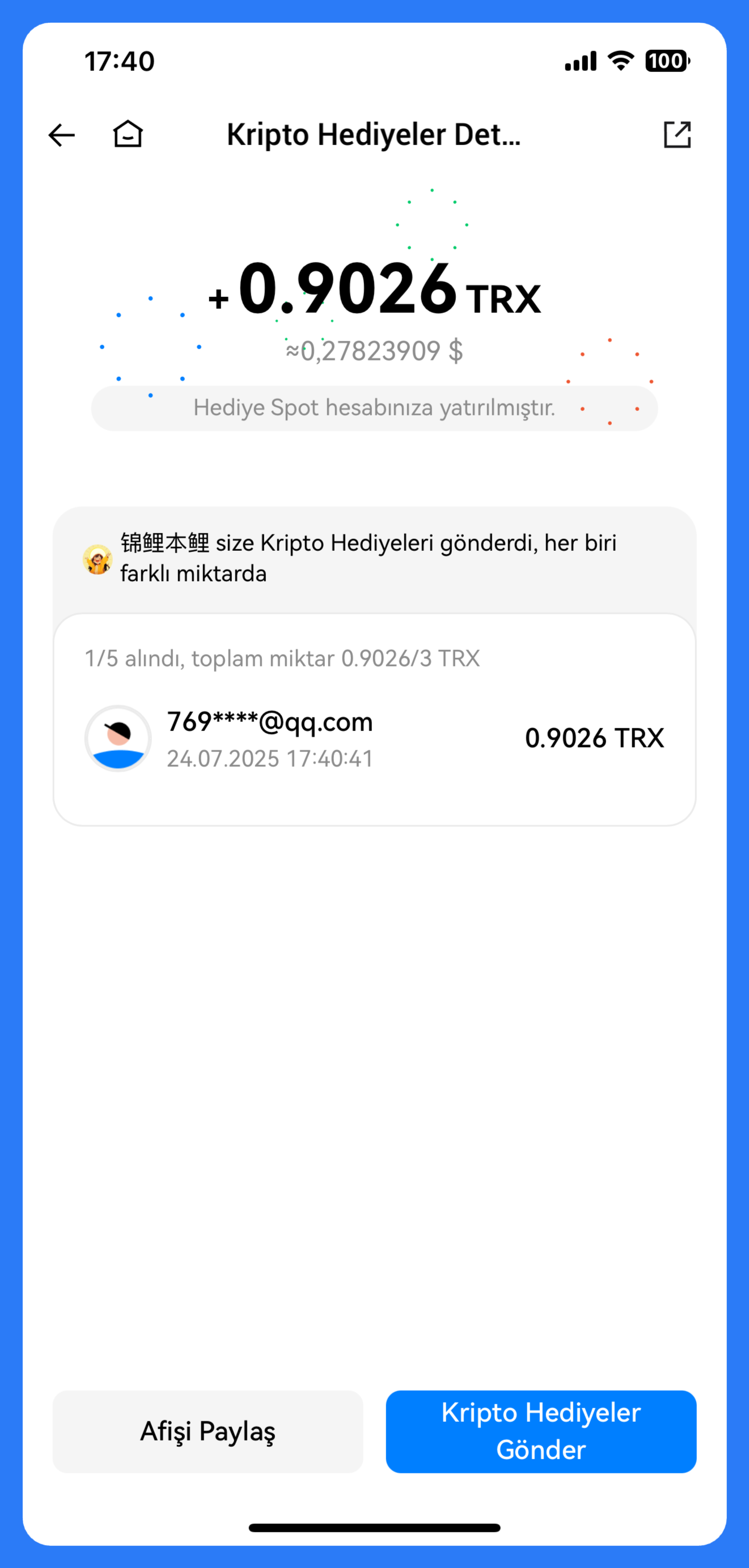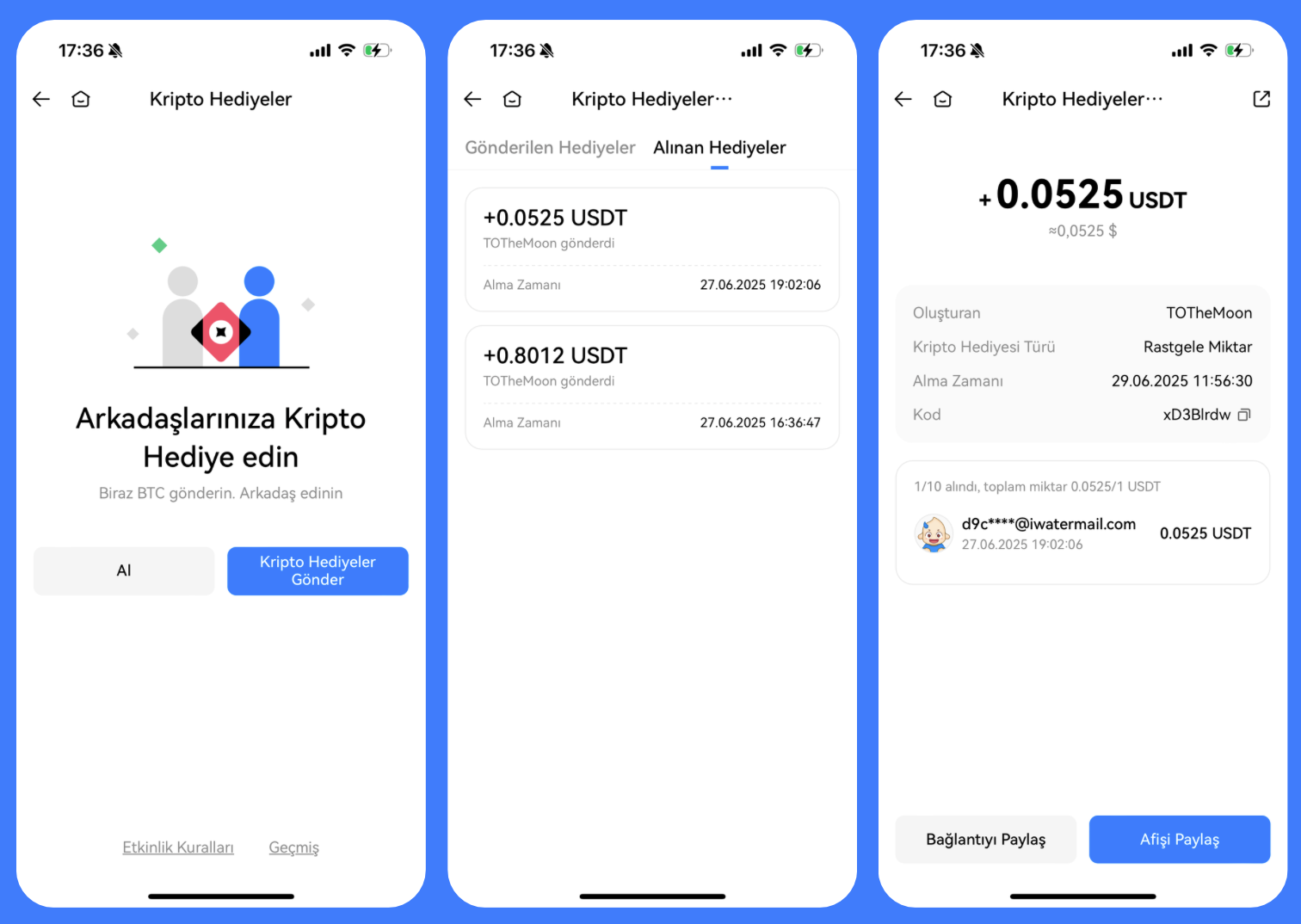 Kendinizi şanslı mı hissediyorsunuz? Kripto Hediyeleri Ayrıntılar sayfasında, arkadaşlarınızı davet etmek ve iyi duyguları paylaşmak için Paylaş'a dokunun. Ayrıca, arkadaşlarınıza hediye vermek için Kripto Hediyeleri Gönder'e dokunabilirsiniz.