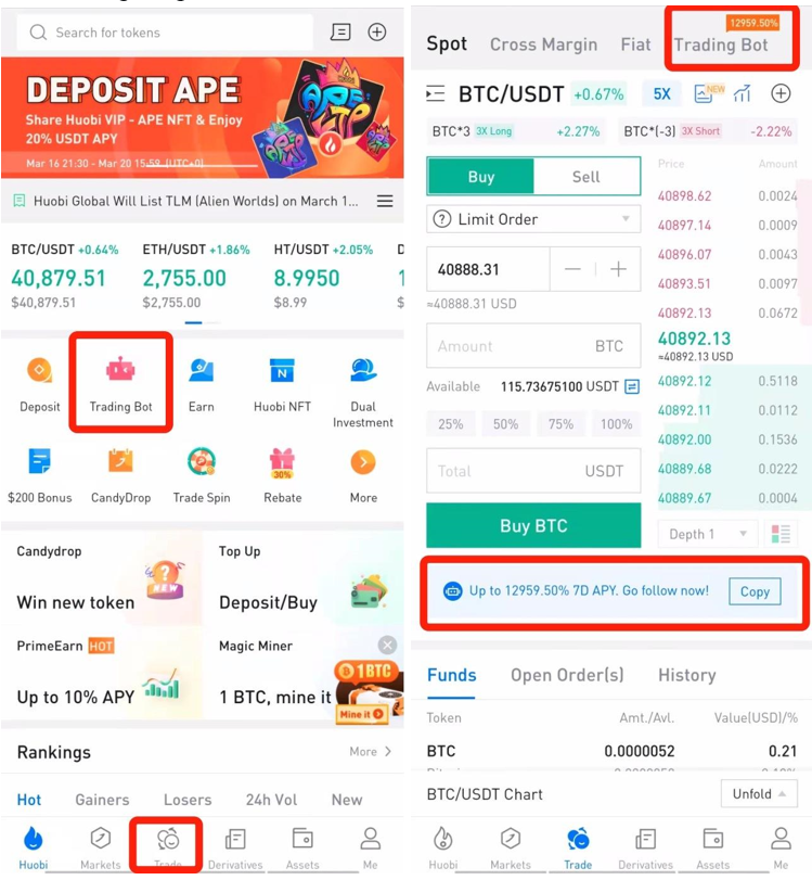 HTX Uygulamasında oturum açın ve iki yöntemden birini kullanarak Martingale İşlem Botu sayfasına erişebilirsiniz: