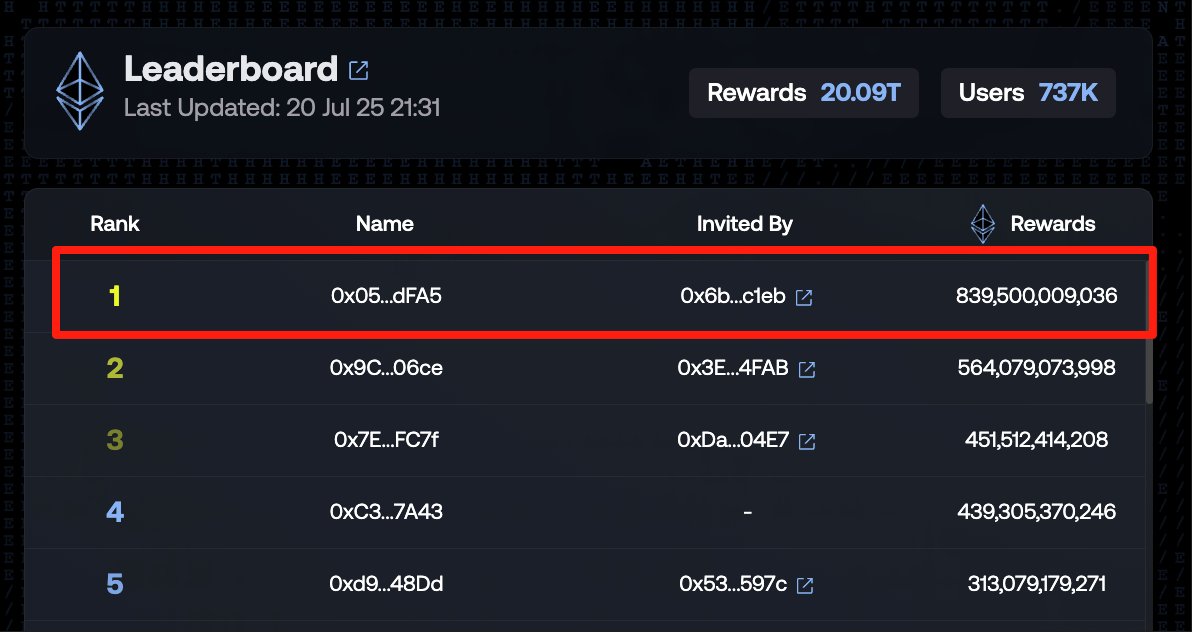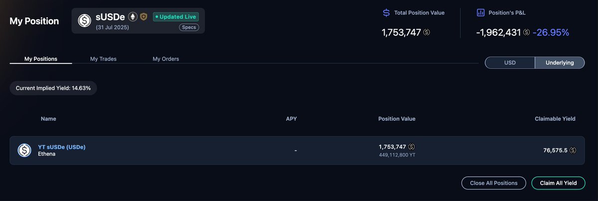 Ethena 积分排行榜 TOP1 巨鲸在 05.21 - 06.03 $ENA 币价下跌期间($0.37 > $0.28) 买入近 4.5 亿枚 07.31 到期的 sUSDe YT(约 500 万美元),根据当前 sUSDe APY 9.74% 估算一天能产生 12 万美元的利息收益!