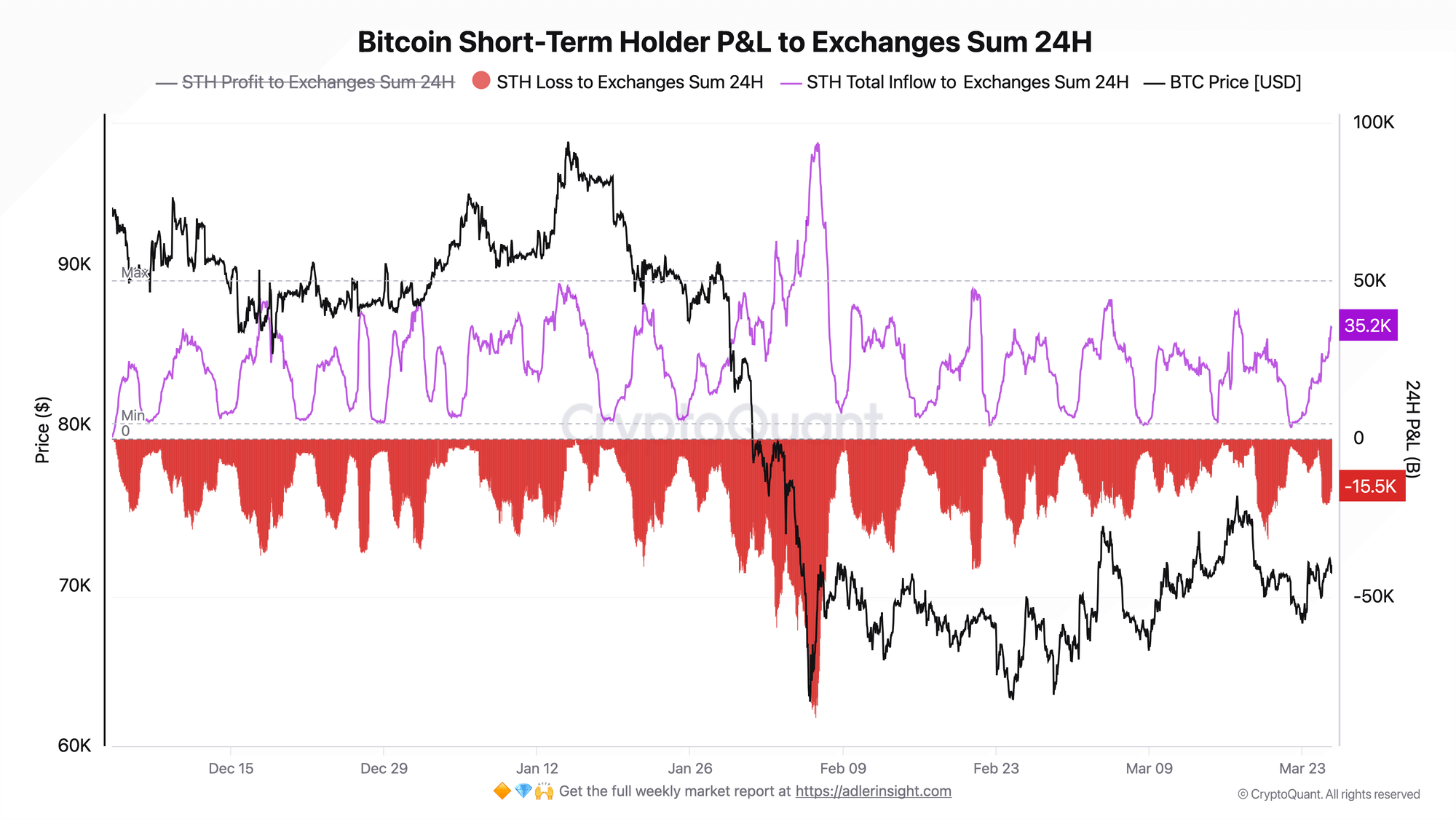 Adler’s second dataset examines the other side of the market structure equation — and it is considerably less comfortable than the ETF picture. The Short-Term Holder P&L to Exchanges metric tracks how many BTC retail participants are sending to exchanges at a loss versus a profit over any 24-hour period. Right now, that reading stands at -15,500 BTC per day flowing to exchanges at a loss, against a total STH exchange inflow of 35,200 BTC per 24 hours.