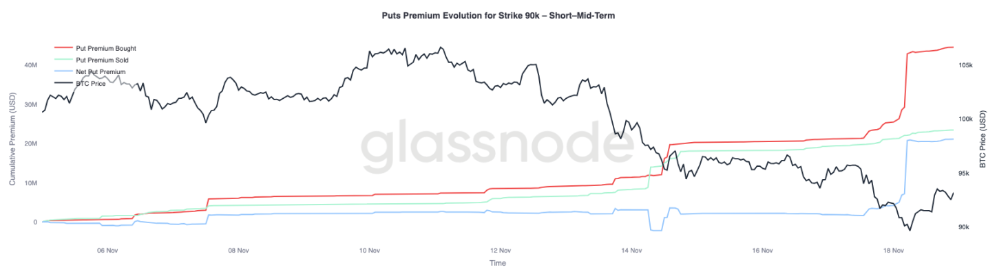 从整体资金流数据进一步聚焦,9 万美元行权价的看跌期权溢价显示,随着价格走弱,保护需求加速上升。过去两周,该行权价的净看跌期权溢价相对平衡,直至比特币跌破 9.3 万美元水平。一旦该支撑位失守,交易者开始主动抬高这些看跌期权的报价,推动 9 万美元行权价的买入溢价大幅上升。
