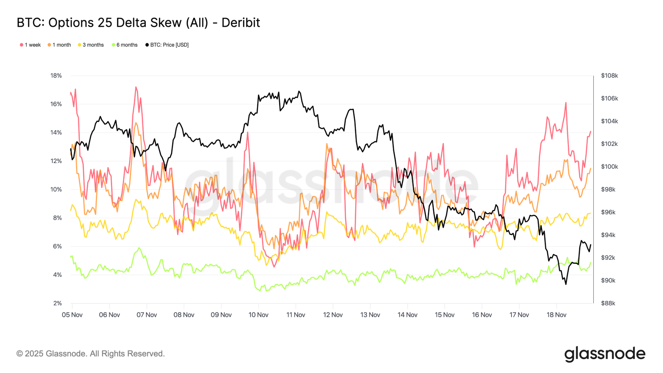 这一行为表明,随着现货抛压加剧,交易者愿意支付越来越高的价格以获取下行保护。这一走势也与此前观察到的短期隐含波动率上升一致 。