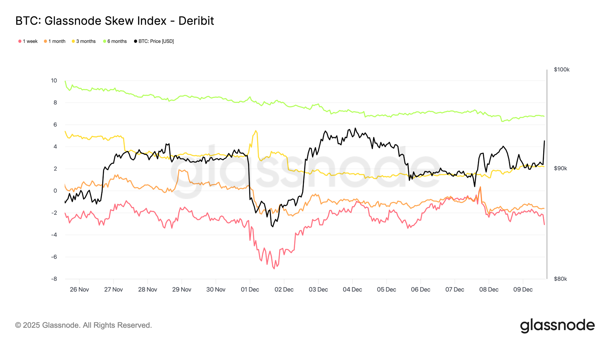 Adding another layer to the options picture, the skew index presents a more nuanced signal compared with the 25-delta skew. Because it is weighted toward low-delta options, it captures pricing across the full downside wing. The one-week and one-month readings sit in put territory, yet the three-month and six-month values, around 2.2 percent and 6.7 percent, fall into call territory, since the index is calculated as calls minus puts.