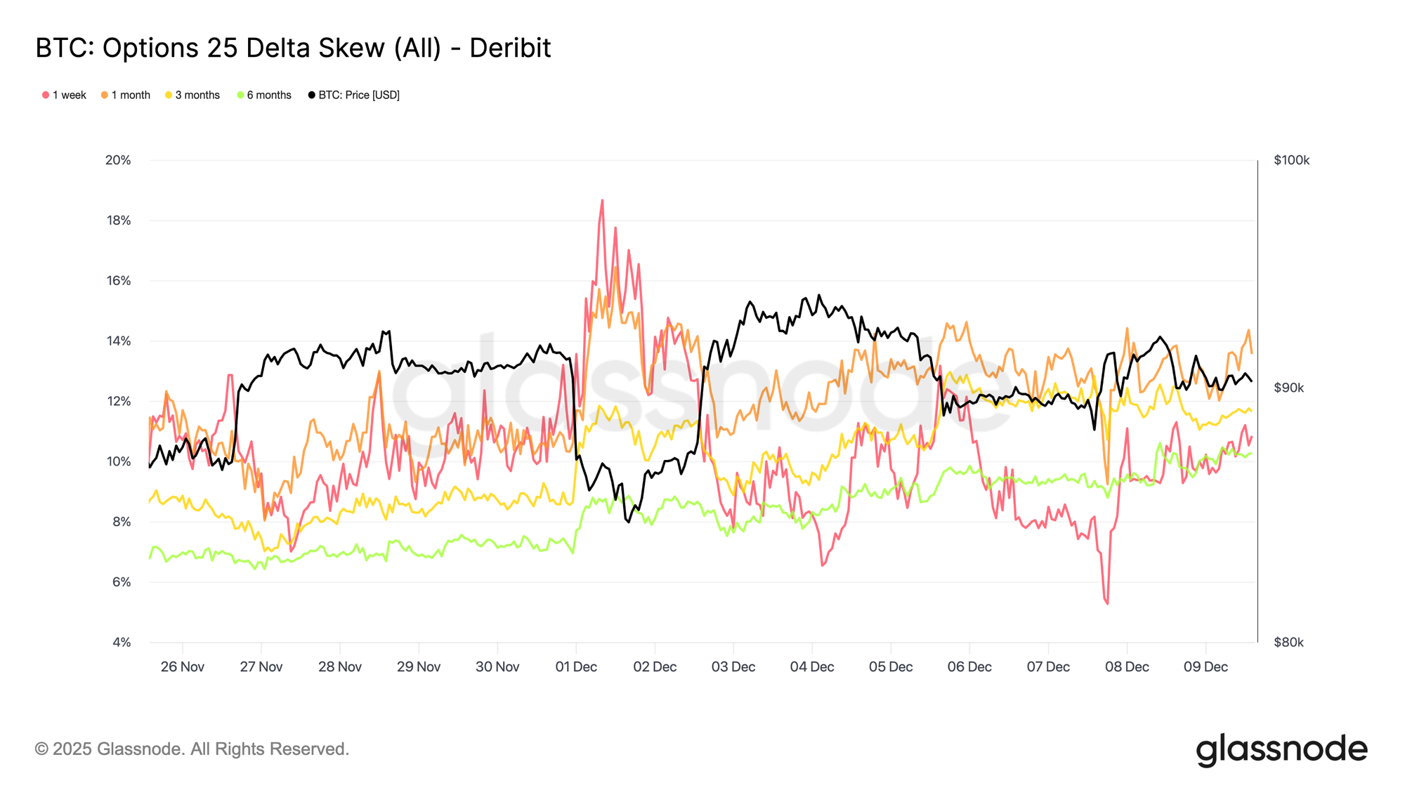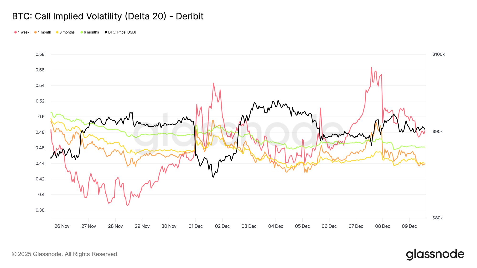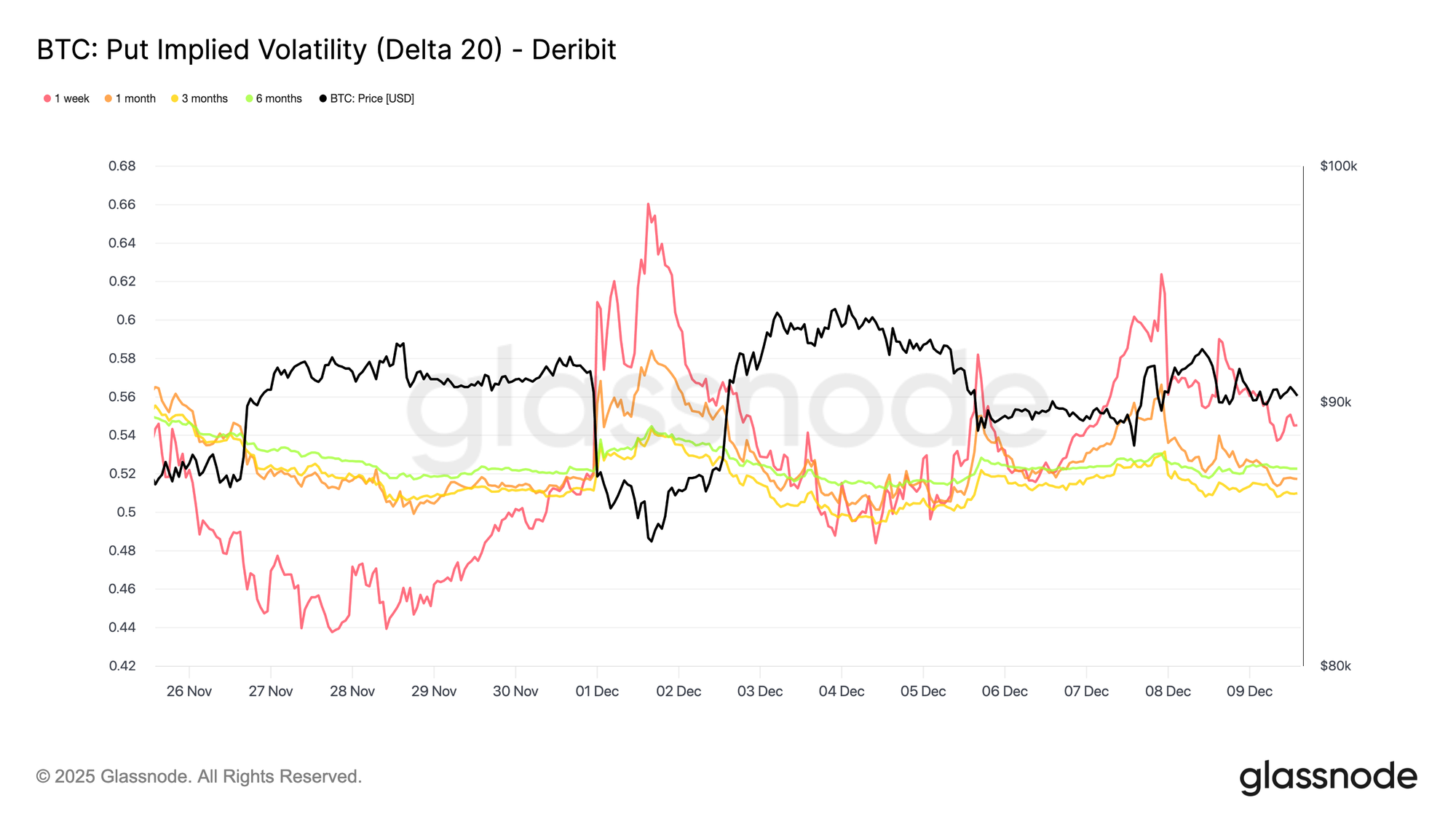 On the 20-Delta CALL, the one-week tenor jumped by roughly ten vol points from last week, while longer maturities stayed relatively flat. The same pattern appears on the 20-Delta PUT, with short-dated downside IV lifting as longer expiries remain quiet.