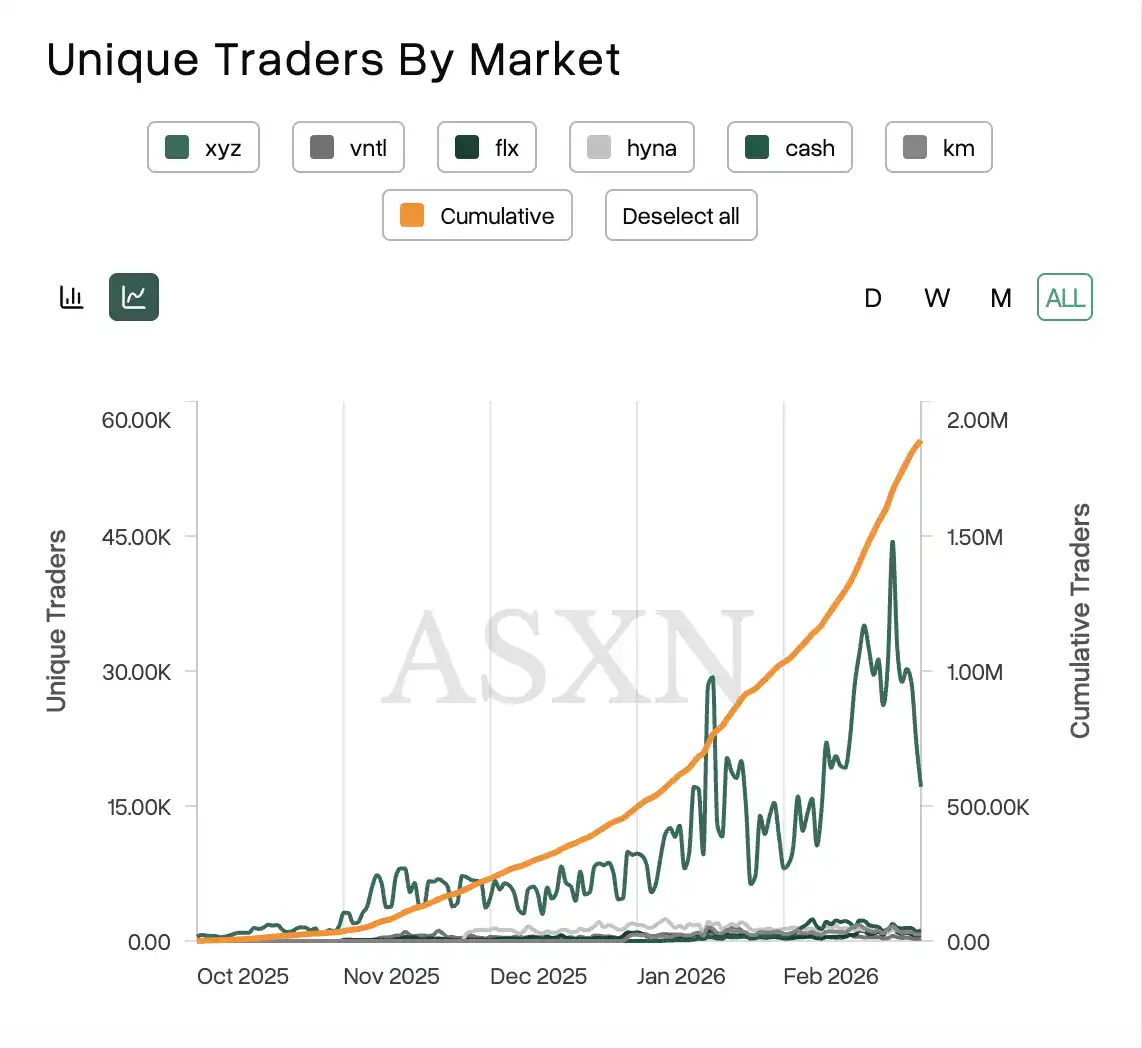 Looking further, the number of unique traders on HIP-3 has cumulatively exceeded 1.85 million (Note: the same wallet connecting on different days is counted as two separate wallets), with over 810,000 new traders added in the past month alone, further confirming the demand for trading tokenized assets.