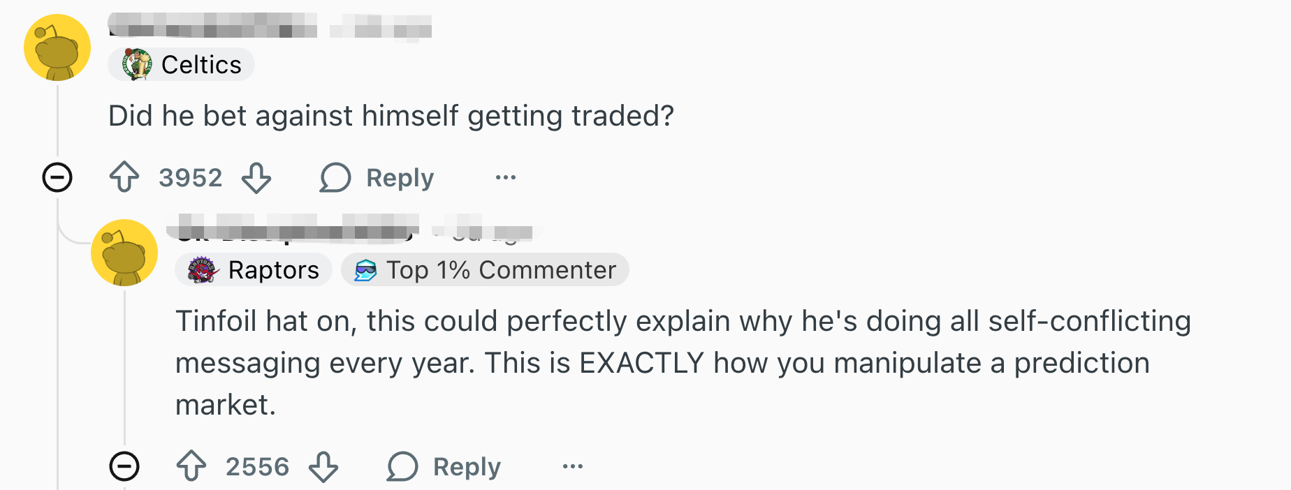 In the cooperation statement, Kalshi emphasized that Giannis would be prohibited from participating in any NBA-related trades. But the real risk remains. Fans are not optimistic about Giannis's willingness, ability, intensity, and transparency in self-regulation. Many fans even began conspiracy theories about whether Giannis himself participated in trades about his stay or leave. Combined with his contradictory statements before the NBA trade deadline, some speculate he was manipulating insider trading while teasing fans.