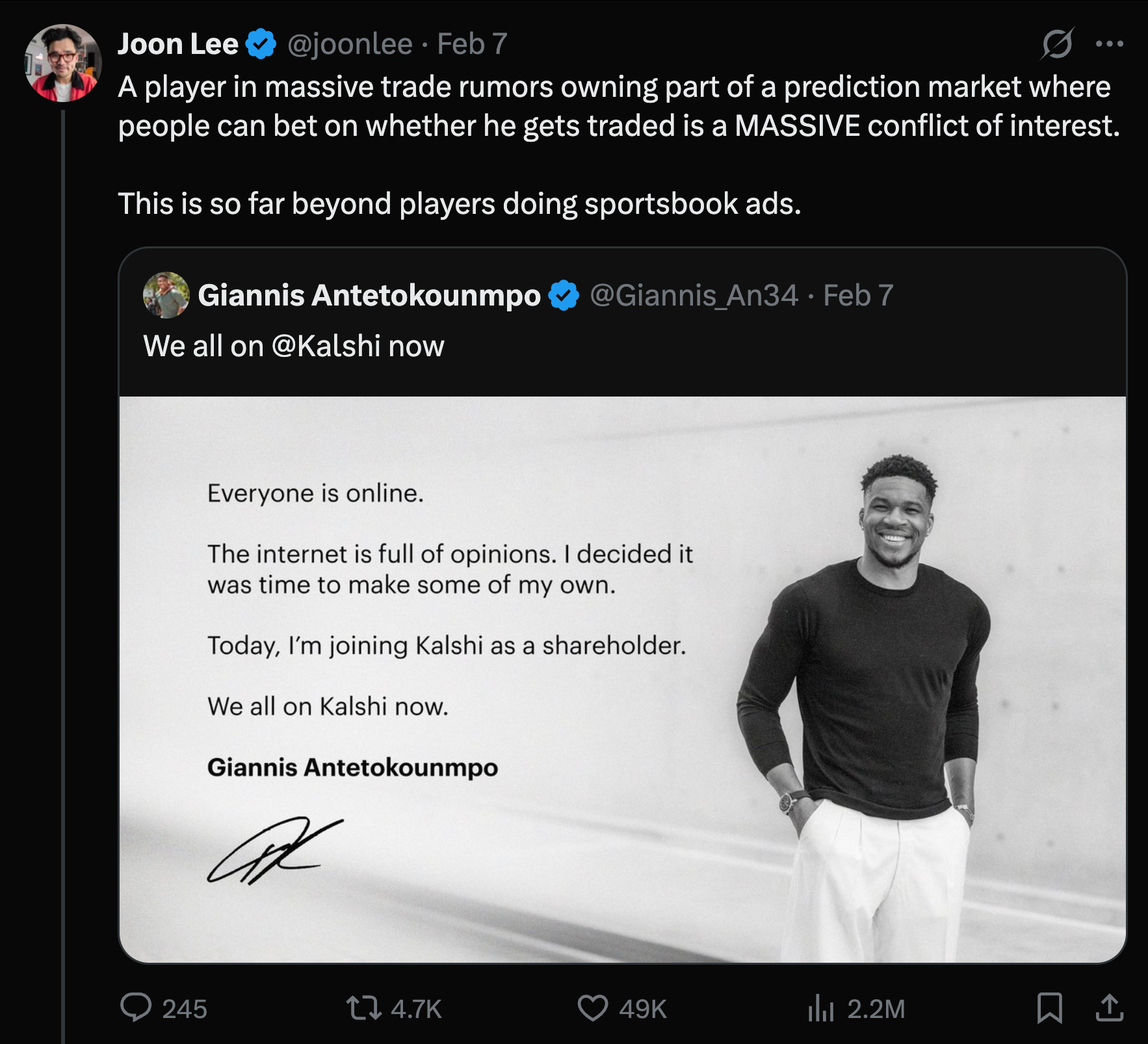 Giannis is the first NBA star with a publicly disclosed interest in Kalshi, but not the first public figure in the league involved in prediction markets.