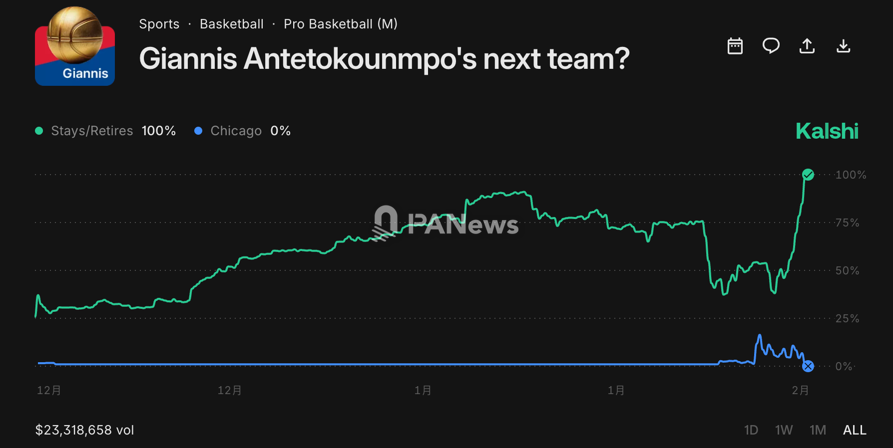 Simultaneously, the event contract surrounding "Giannis's Stay or Leave" on the prediction market platform Kalshi began to enter the settlement phase. This contract accumulated a trading volume of over $23.3 million, making it the highest-traded single NBA event contract besides "NBA Championship Winner."