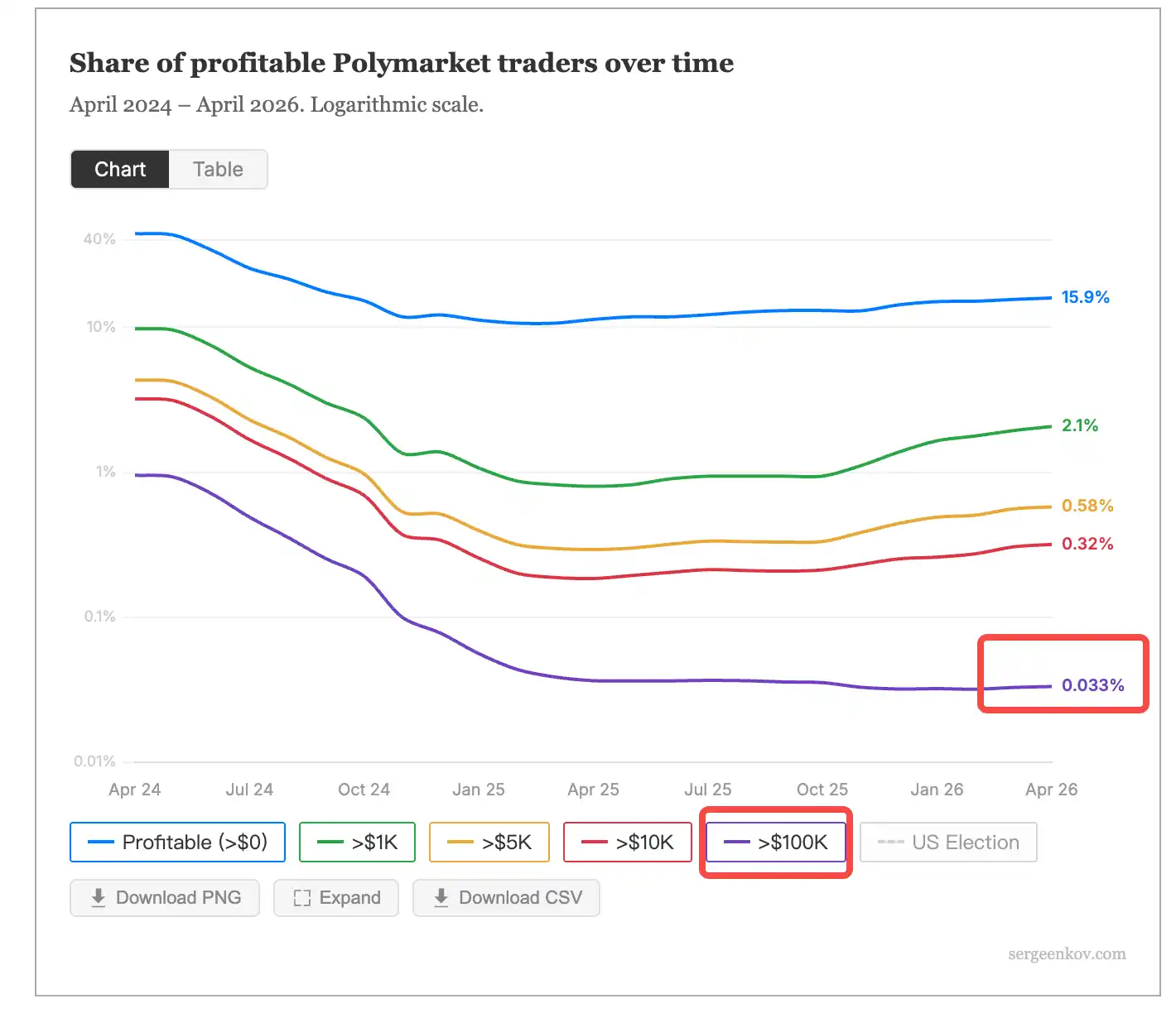 According to Token Terminal data, Polymarket's nominal trading volume over the past 30 days is approximately $9.8 billion, with about 462,600 monthly active traders. The platform's growth itself is not an issue, but the relationship between user growth and user profitability is inverse—Sergeenkov's data shows that the decline in the proportion of profitable traders is directly related to peaks in user growth, especially the influx after the November 2024 U.S. election.