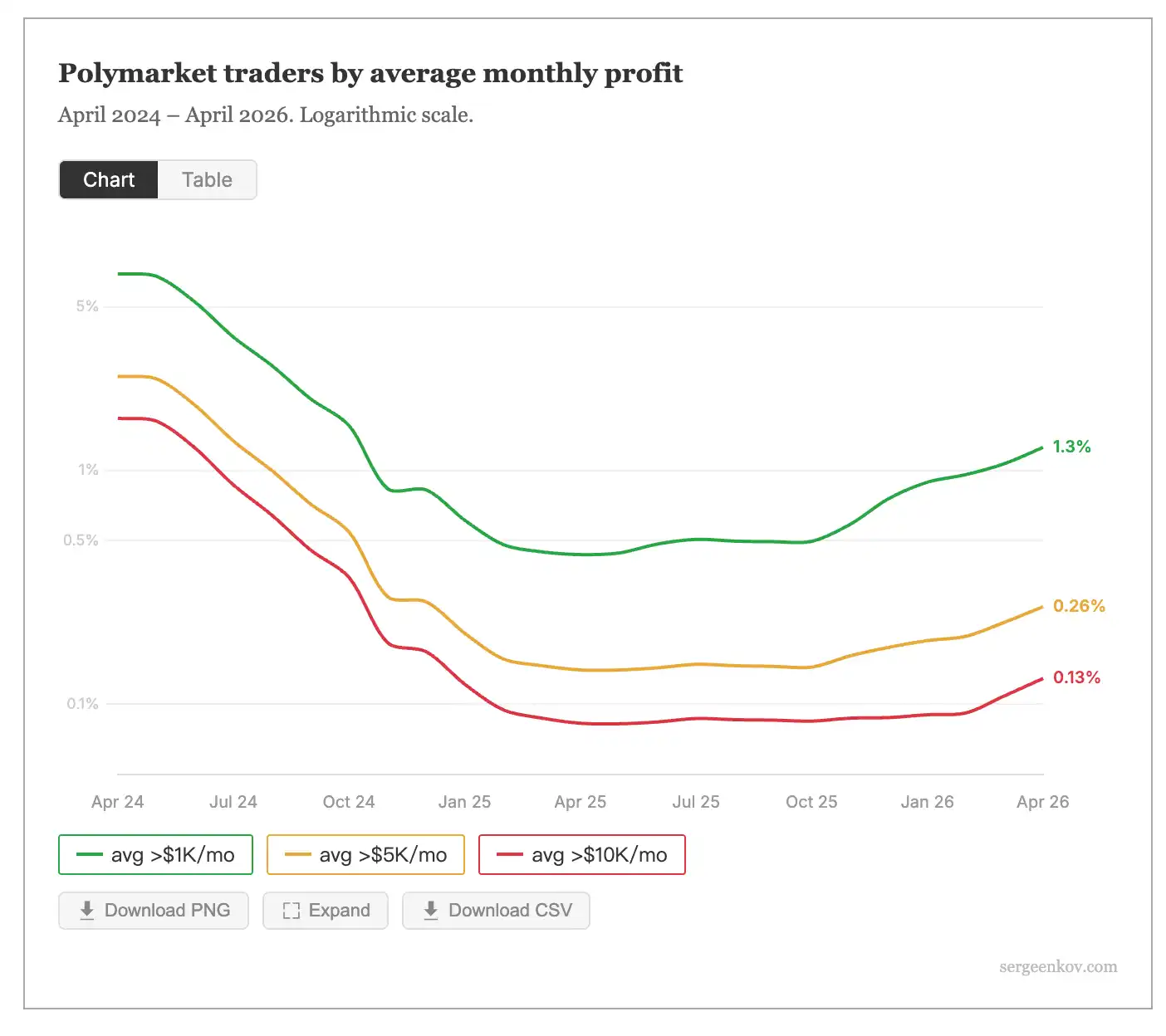 The numbers in the high-profit range are quite stark: addresses with average monthly profits exceeding $1,000 account for 1.25%; those exceeding $5,000 are only 0.26%, about 6,600 addresses; and those exceeding $10,000 drop to 3,250, representing 0.13% of all traders.