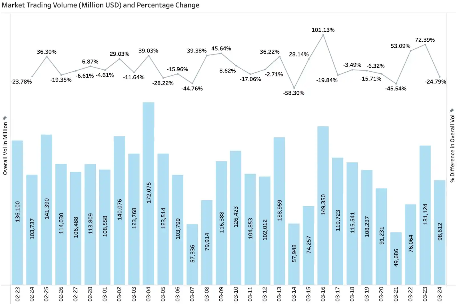 According to CoinGecko data, overall market trading volume in March showed a distinct pattern of "sporadic surges followed by rapid declines," with volatility significantly higher than February. Volume quickly expanded to a阶段性 high in early March to around March 4th (approx. $170 billion level), then rapidly retreated; it surged again mid-month driven by sentiment and events, with a single-day increase of 101% on March 16th, but sustainability was still lacking, leading to another period of lower volume. Rhythm-wise, volume spikes were highly concentrated around short-term sentiment catalysts or event shocks (like increased market volatility or on-chain/security事件), while volume remained at low-to-medium levels at other times, indicating capital was primarily driven by short-term speculation and trading, with a continued absence of medium-to-long-term incremental capital. Volume weakened further in late March, accompanied by multiple large negative growth days (e.g., -45%, -24%), indicating a marginal decline in market activity. Overall, while March saw stronger explosive volume spikes at specific points compared to February, the lack of continuous volume means a stable uptrend has not formed, with structural and event-driven行情 still dominant.