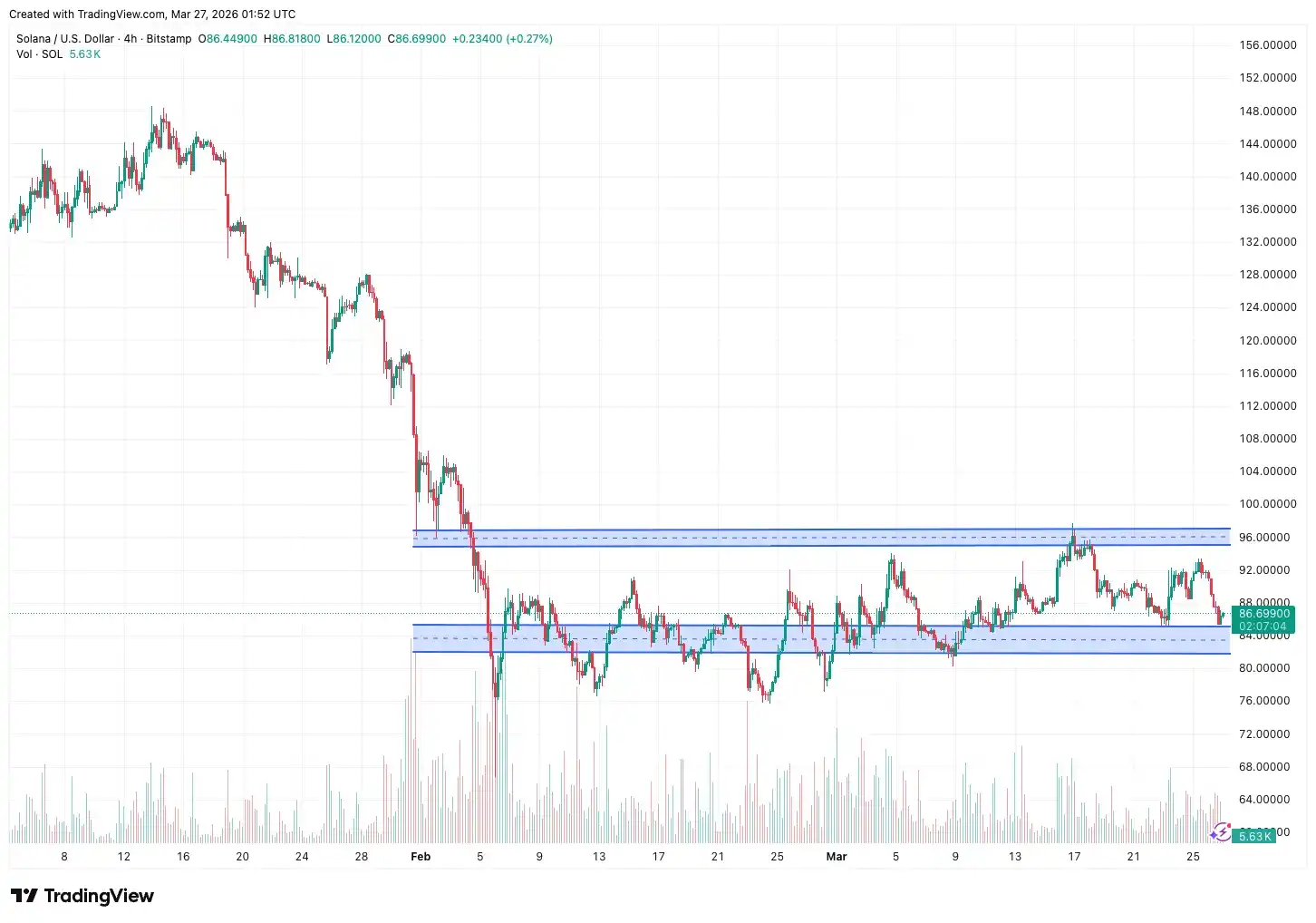 Solana's performance in March was relatively stable, trading within an $82–$97 range, showing some resilience compared to BTC and ETH. As of March 27th, SOL was around $88–$92, slightly changed from the end of February. Short-term support is mainly around $82–$85, a level that has provided a floor multiple times recently; above, $95–$97 is the key resistance zone, corresponding to the mid-March high—a break requires strong volume配合. If SOL can hold firmly above $90 and break above $97 with volume, it could initiate a recovery towards $100–$105. Conversely, a break below $82 could lead to a further decline towards the $75–$78 medium-term support. Overall, SOL's volatility remains high. Until macro risk appetite improves, its price will likely continue seeking a directional breakout within the $82–$97 range.