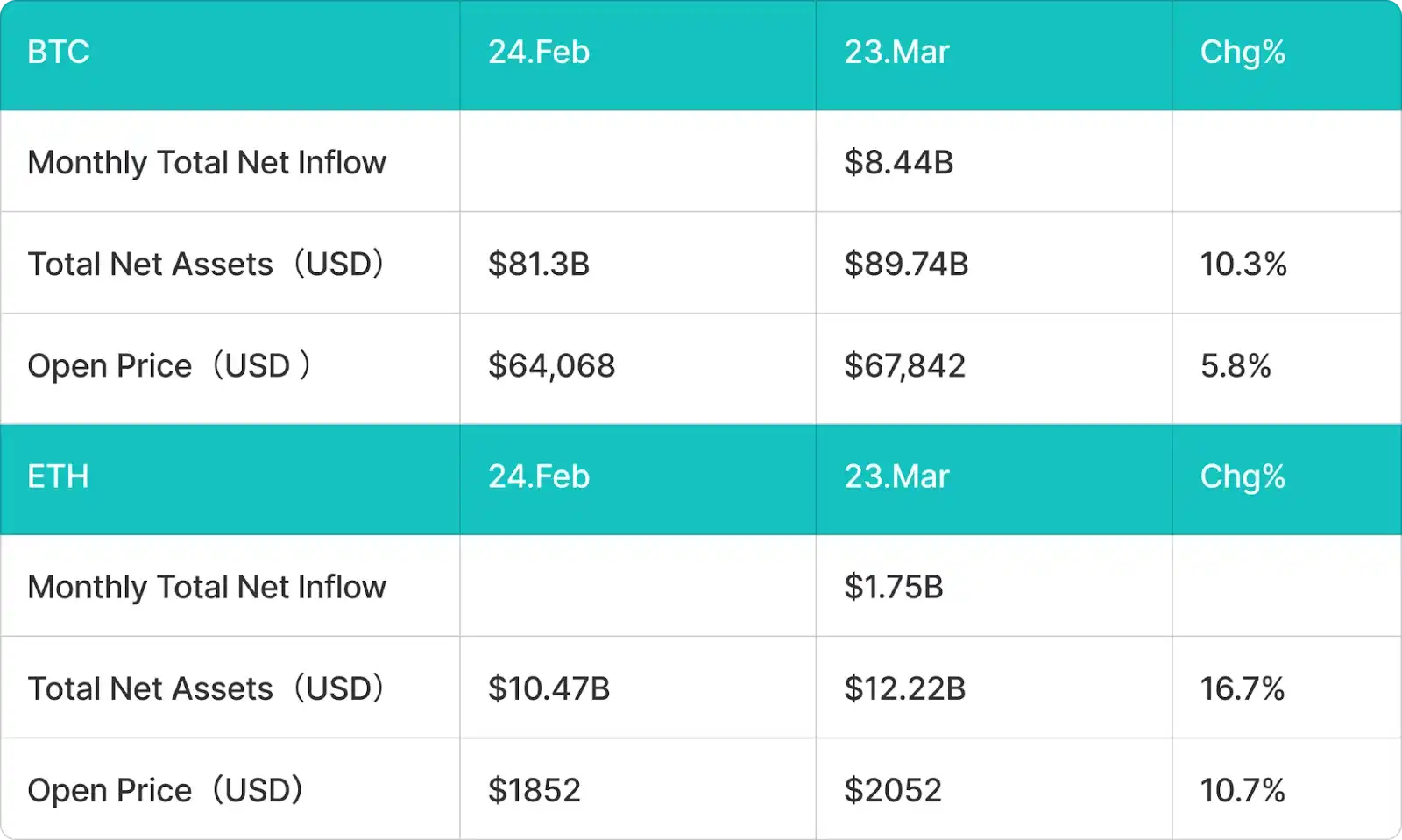 BTC spot ETF flows strengthened noticeably in March, showing an inflection point from net outflows to net inflows. BTC spot ETFs achieved net inflows of approximately $8.44 billion this month. Total net assets increased from about $81.3 billion on February 24th to $89.74 billion, a环比 growth of about 10.3%. Price-wise, BTC rose from around $64,068 at the start of the month to $67,842, a gain of about 5.8%. Overall, the return of ETF inflows and price recovery formed a positive feedback loop, indicating some repair in institutional risk appetite. Compared to February's concentrated outflows, March更像是 a阶段性 reallocation process. On one hand, marginally improved macro liquidity eased pressure on risk assets; on the other, BTC's significant earlier correction made it valuationally attractive, prompting institutions to rebuild exposure. This resulted in a "capital回流 + price stabilization" repair characteristic.