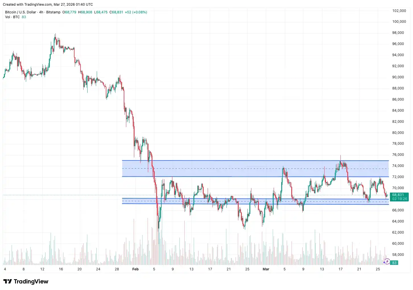 In March, Bitcoin's price experienced wide fluctuations within a $62,000–$74,000 range. After a short-term rebound to around $69,000 on February 25th following the end of five weeks of net outflows, BTC entered a period of range consolidation. Major resistance was concentrated around $72,000–$75,000, which it tested multiple times during the month without a decisive break. Key support below was around $65,000–$67,000; it briefly tested the $63,000–$64,000 zone before quickly bouncing back. Following the hawkish FOMC statement on March 18th, BTC fell about 5% in a day, retesting the $67,000–$68,000 support. As of March 27th, it was trading around $69,000–$71,000, still within the range. A decisive break and hold above $74,000 could open the path for a recovery towards $78,000–$82,000. Conversely, a break below $65,000 could lead to a further decline towards the $60,000–$62,000 medium-term support. Overall, Bitcoin is currently in a range-bound pattern, with $65,000–$67,000 as primary support and $72,000–$75,000 as near-term resistance. A directional breakout signal still requires配合 from an improved macro environment.