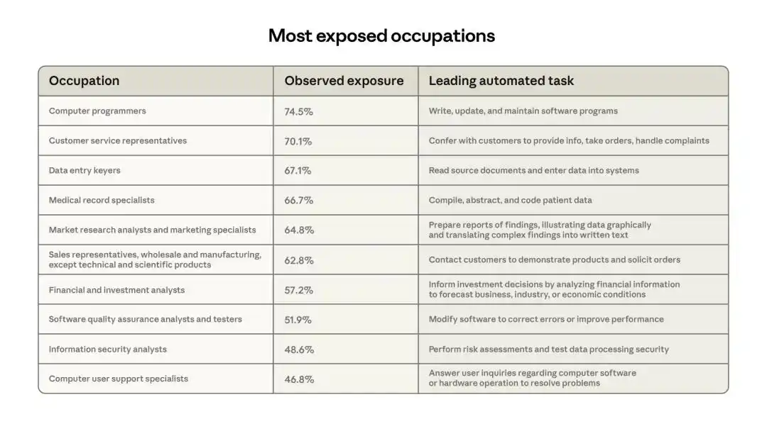 数据显示,高 AI 实际暴露度十大职业榜上,程序员以 74.5% 的任务覆盖率位居榜首(契合代码开发类 AI 高频使用特征);客服专员依托官方 API 接口的高频应用位列第二,为 70.1%;数据录入员因资料录入流程高度自动化,覆盖率达 67%,排名第三。