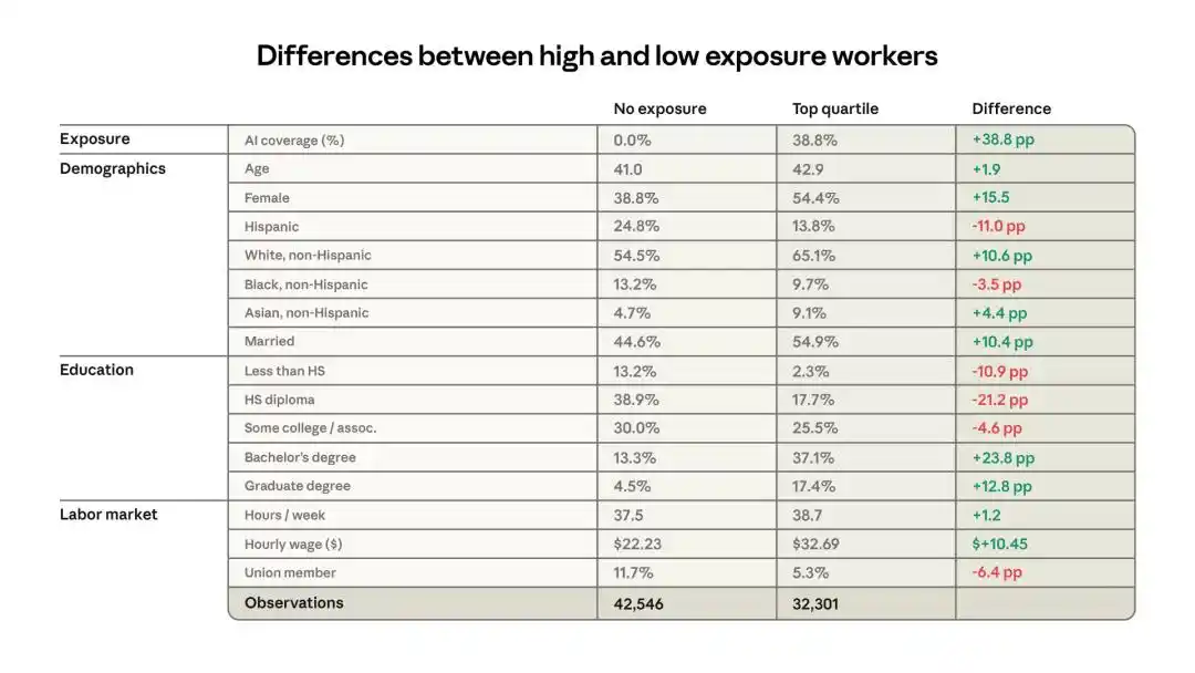 近日,Anthropic 发布了一项研究,精确描绘了当前 AI 正在替代哪些工作。最容易受到影响的群体出乎意料:他们更年长、受教育程度更高、收入也更高(比平均水平高出 47%)。并且,他们拥有研究生学历的概率几乎是那些尚未被 AI 影响人群的四倍。