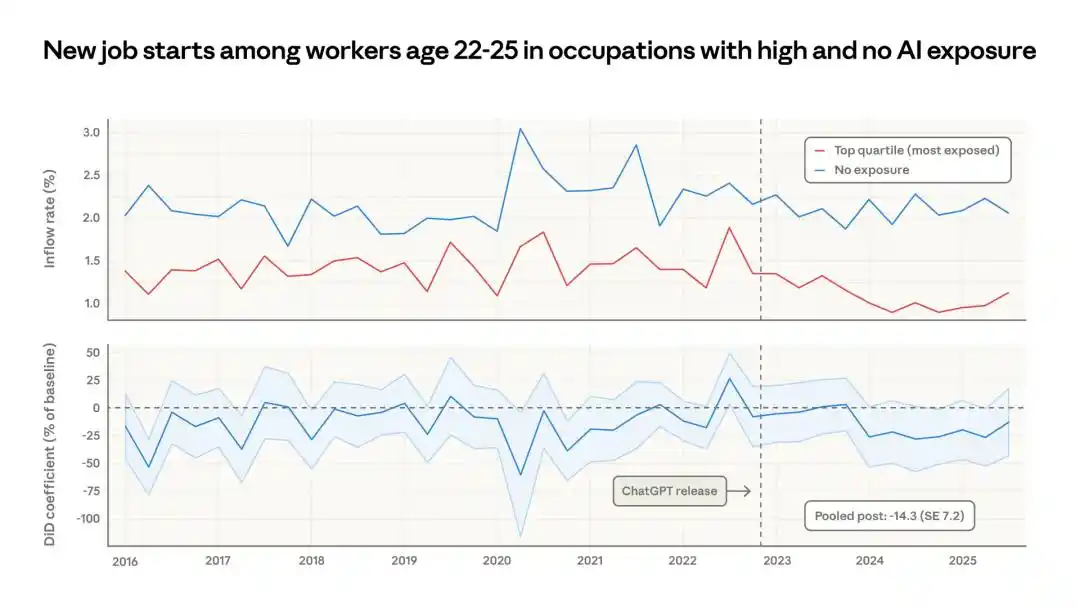 此外,Anthropic 的研究人员发现,剔除 2020 至 2021 年特殊波动周期后,2024 年两类岗位的青年招聘走势出现明显分化:企业面向青年群体的高 AI 暴露类岗位招聘意愿显著下降。其中,低暴露度职业月度新增入职率稳定维持在 2%,而高暴露度岗位新人入职比例下降约 0.5 个百分点。综合测算显示,自 ChatGPT 普及以来,高暴露职业的青年入职率较 2022 年下滑 14%,该结果处于边际统计显著水平;而 25 岁以上劳动者并未出现同类招聘萎缩现象。