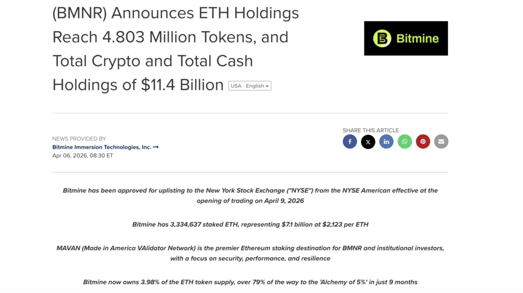 BitMine is heading to the NYSE with a balance sheet that’s heavily tilted towards Ethereum. As of 06 April, the firm reported $11.4 billion in total holdings, led by 4,803,334 ETH valued at roughly $10.2 billion, based on a price of $2,123.