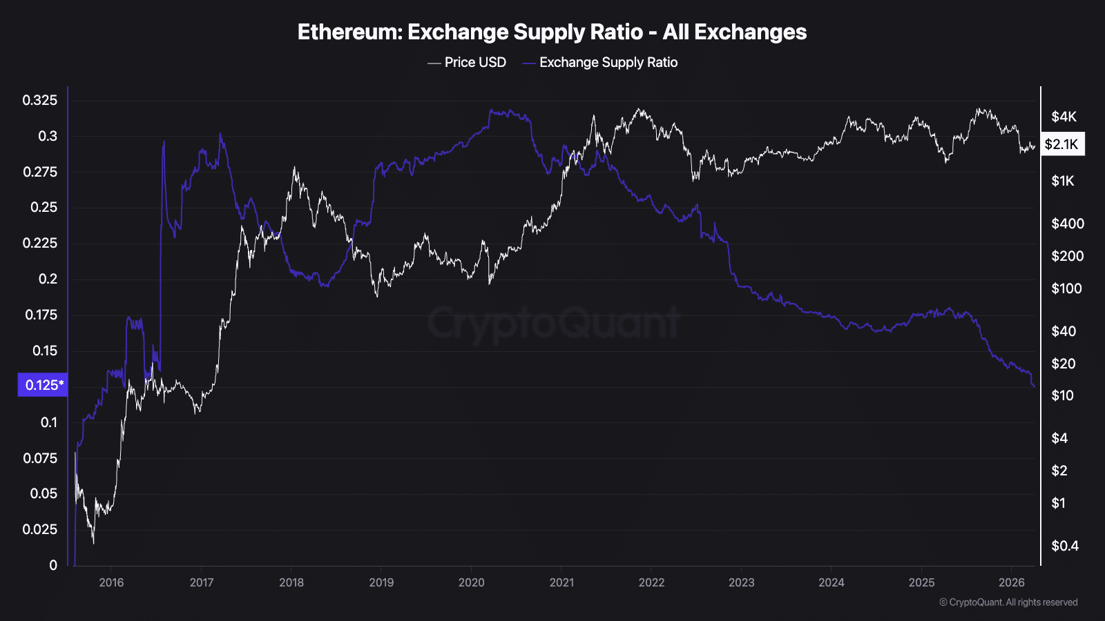 This is happening as (or because of) Ethereum’s exchange supply ratio falls to 0.125 – A decline in the amount of ETH readily available for trading.