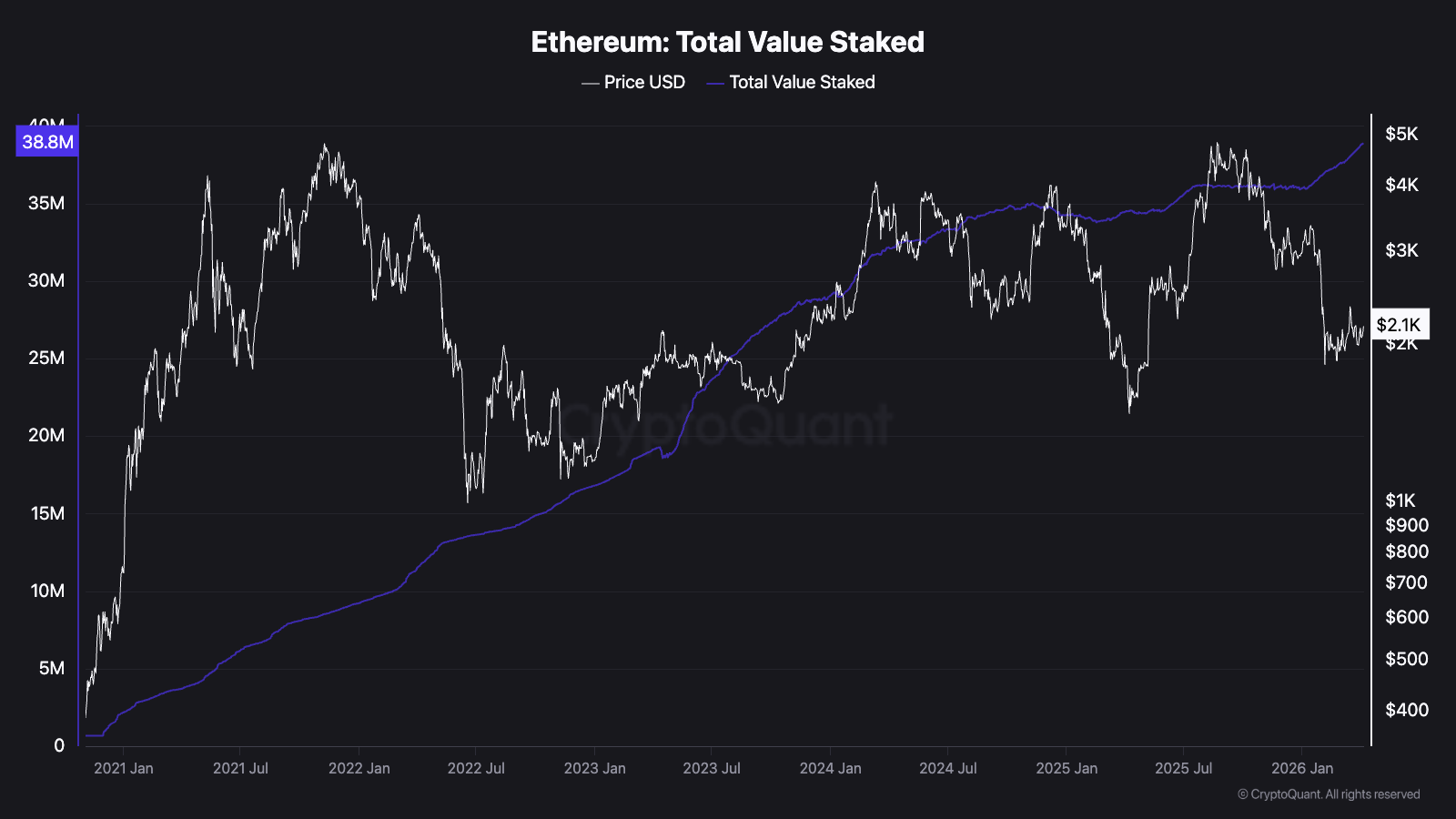 AThe two key on-chain metrics are Ethereum's falling exchange supply ratio (to 0.125) and the total amount of ETH staked reaching a new all-time high of 38.8 million.