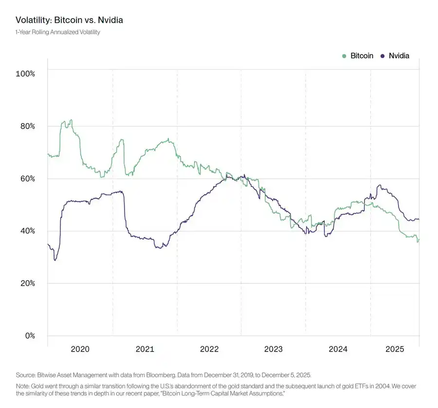 Bitwise's Bold Quantification: Bitwise made a highly impactful prediction—by 2026, Bitcoin's volatility will, for the first time, be lower than Nvidia's. This is not just a numbers game but marks Bitcoin's transformation from a "high-beta tech stock" to a "mature safe-haven asset."