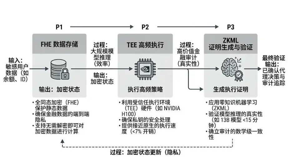 The future technological trend is not the victory of a single path, but the comprehensive popularization of "Hybrid Confidential Computing." In a complete AI business flow: use TEE for large-scale, high-frequency model inference to ensure efficiency; use ZKML at key nodes to generate execution proofs to ensure authenticity; and let FHE handle the encryption of sensitive financial states (such as account balances and private IDs).