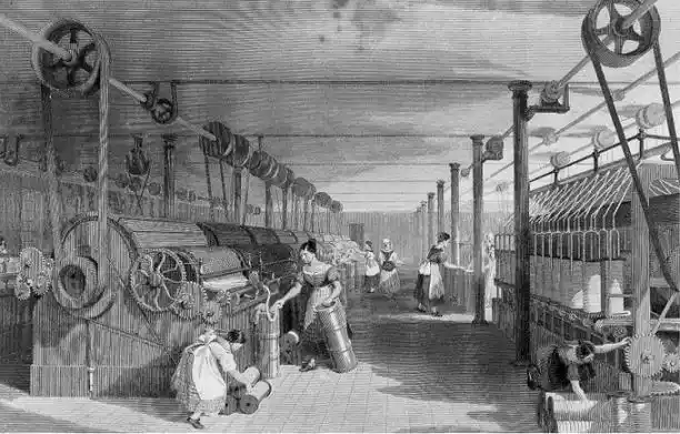 An 1835 engraving by Thomas Allom depicting a steam-powered textile mill in Lancashire, England.