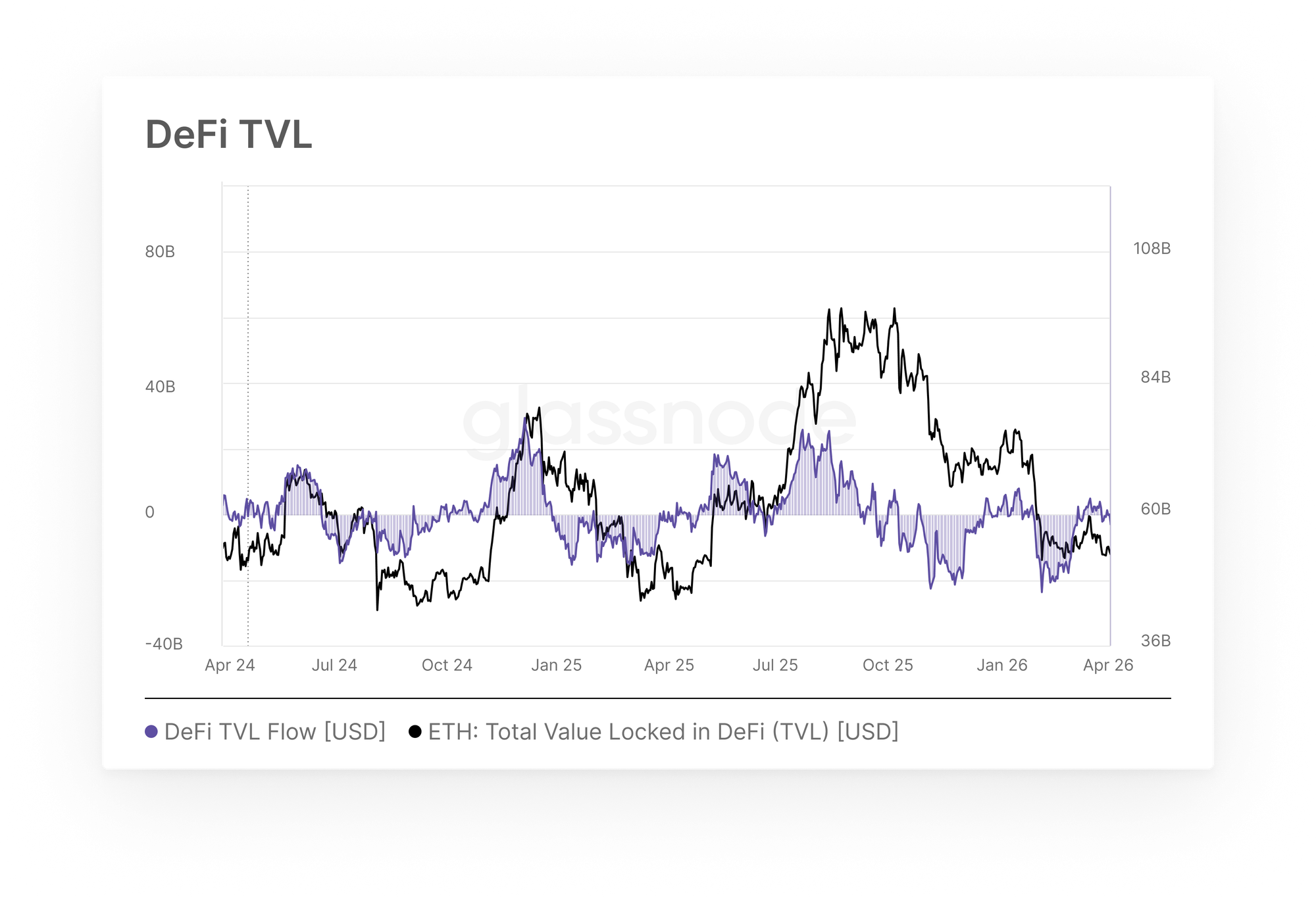 After registering peak monthly outflows of $17.8B at end of February, Ethereum DeFi TVL flows recovered sharply through March, turning positive in mid-month and closing the period near neutral at -$0.75B. The pace of recovery was notable, with flows moving from double-digit outflows in early March to briefly positive readings around $4.9B by mid-month before settling back. While the trend shift is meaningful, a single month of stabilization is insufficient to declare a reversal of the broader contraction that has persisted since August 2025, and sustained inflows would be required to confirm a genuine return of allocator conviction in on-chain yield strategies.