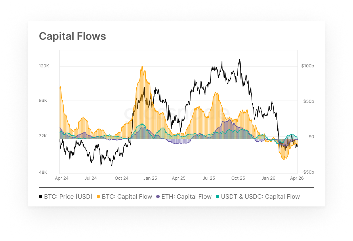 - BTC and ETH capital flows remained negative through March but continued to recover from February lows, while stablecoin inflows moderated alongside the broader stabilization.