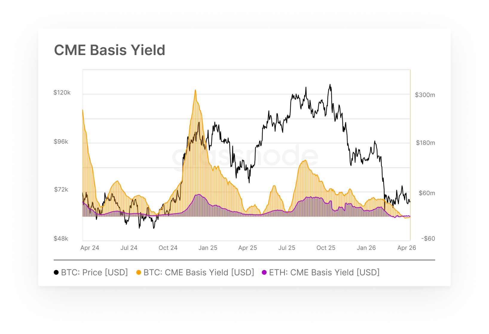 - BTC CME basis yield turned negative through March, erasing the carry trade entirely, while ETH basis yield remained subdued but showed tentative signs of recovery by month-end.