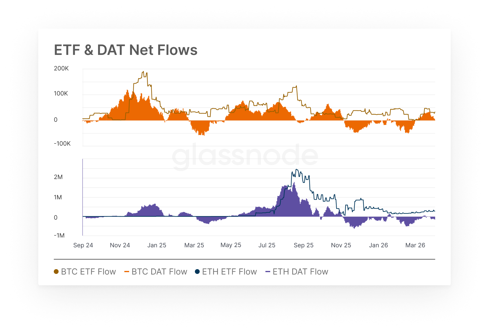 Bitcoin ETF and DAT flows finally turned positive through March, reaching intra-month highs of +30.6k BTC and +46.8k BTC respectively mid-month before settling back to +17.6k BTC and +30.9k BTC by month-end. Ethereum flows mirrored the directional shift with less intensity, as ETF flows reached +46.6k ETH and DAT flows peaked at +295.9k ETH before easing to +261.9k ETH at close. The mid-month surge followed by minor pullback, suggests demand remains sensitive to wider market conditions, rather than a true sustained structural shift in institutional positioning.