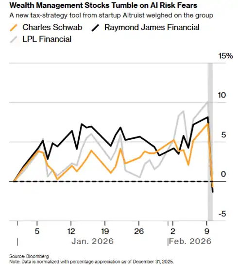 The latest round of selling erupted on Tuesday when a tax strategy tool launched by a little-known startup, Altruist Corp., caused shares of Charles Schwab Corp., Raymond James Financial Inc., and LPL Financial Holdings Inc. to fall by 7% or more.