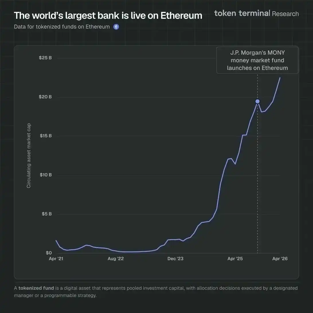 • Need to generate yield on idle funds: Felix has over $165,000 in funds and (in Nat's words) "doesn't know what to do with it." On Ethereum, these funds could be deposited into lending protocols, used to buy tokenized treasuries like BlackRock's BUIDL, or deployed as liquidity on Uniswap, all permissionlessly, instantly, and composably. Tokenized treasury products on Ethereum are growing rapidly, with over $22.5 billion in fund assets tokenized on the network (71.9% market share across all blockchains). J.P. Morgan launched its MONY market fund on Ethereum in early 2026, joining BlackRock's BUIDL and Franklin Templeton's on-chain money market fund. These institutional-grade products are exactly what autonomous Agents with idle funds need, running on permissionless infrastructure that any Agent can access without a brokerage account.