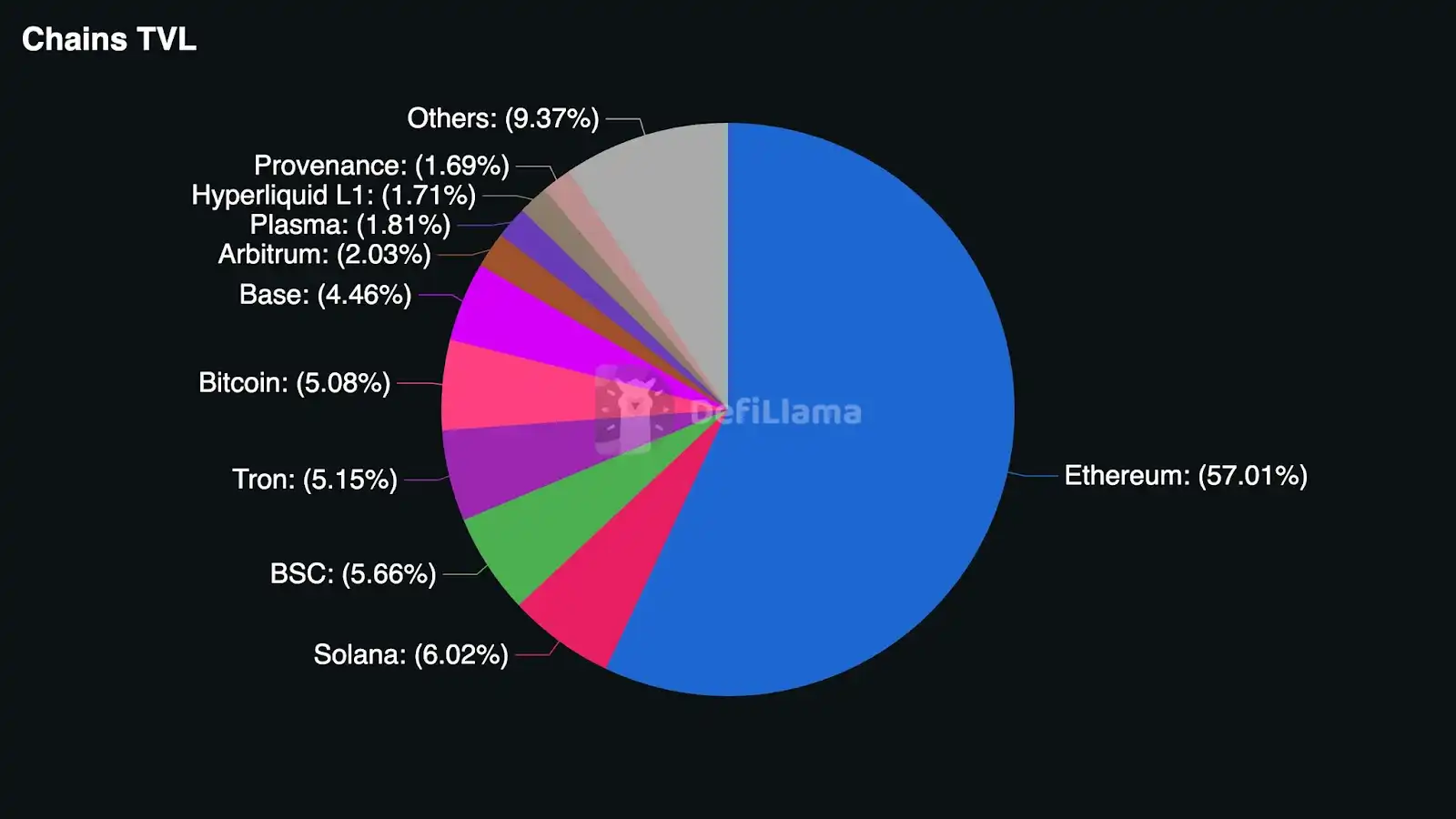 57% of DeFi TVL resides on Ethereum (Source: DeFi Llama)