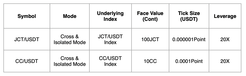 HTX has launched JCT/USDT and CC/USDT perpetual futures, which supports 1-20x leverages for long and short trades.