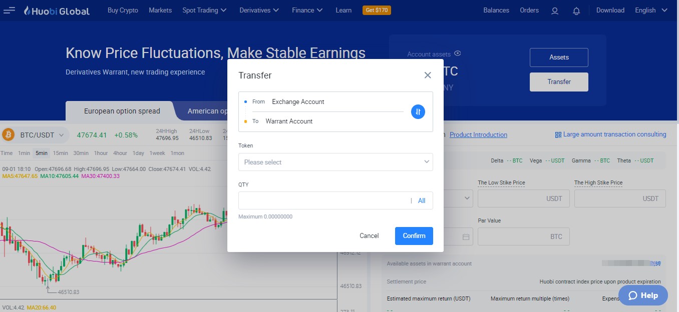Натисніть кнопку «Перевести», виберіть вихідний обліковий запис і введіть суму (у USDT), щоб перевести активи на ваш рахунок опціонів.
