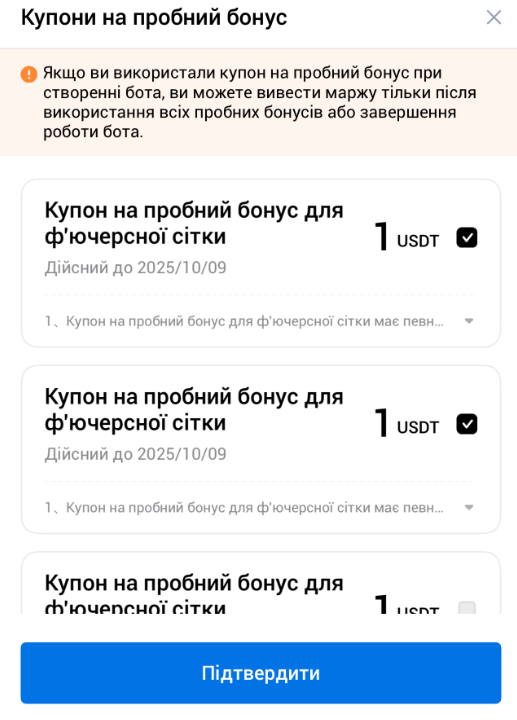 - Купони на пробний бонус для ф'ючерсної сітки не можуть бути використані з ботами ф'ючерсної сітки з встановленою тригерною ціною.
