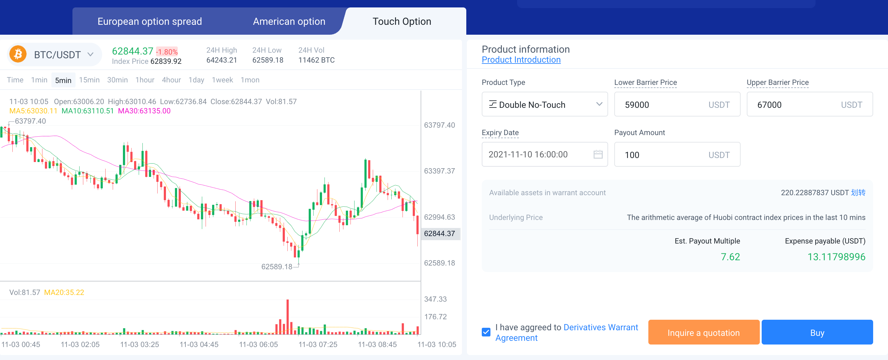 $BTC зараз торгується на рівні 62 844 USDT. Боб вважає, що присутній бічний ринок, і є хороший шанс, що ціна залишиться в діапазоні від 59 000 до 67 000 USDT протягом найближчих 7 днів. Він купує опціон DNT за 13,12 USDT з такими умовами: