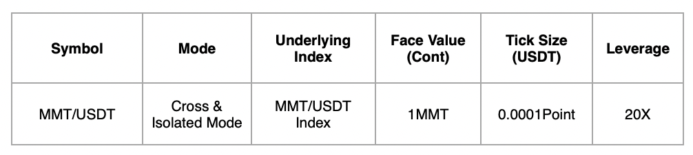 HTX has launched MMT/USDT perpetual futures, which supports 1-20x leverages for long and short trades.
