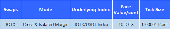 HTX Futures will launch IOTX/USDT Swaps at 6:00 am on Aug. 13, 2021 (UTC). Using stablecoin USDT as the margin currency, these swaps support bi-directional trading. The corresponding elements of these USDT-margined swaps are as below: