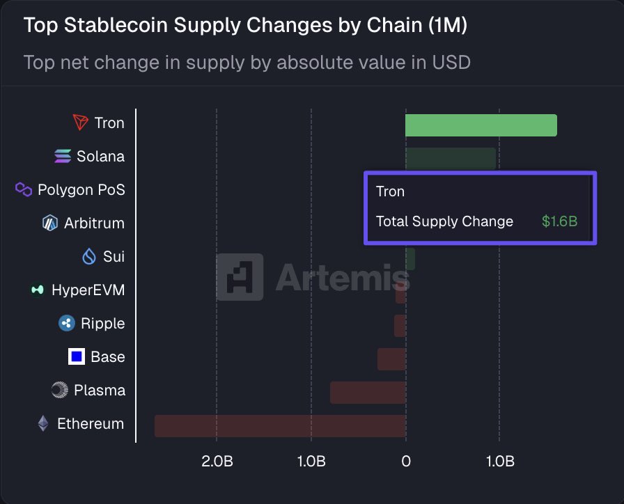 数据显示,TRON 单月稳定币供应净增加约 16 亿美元,在所有公链里排第一。