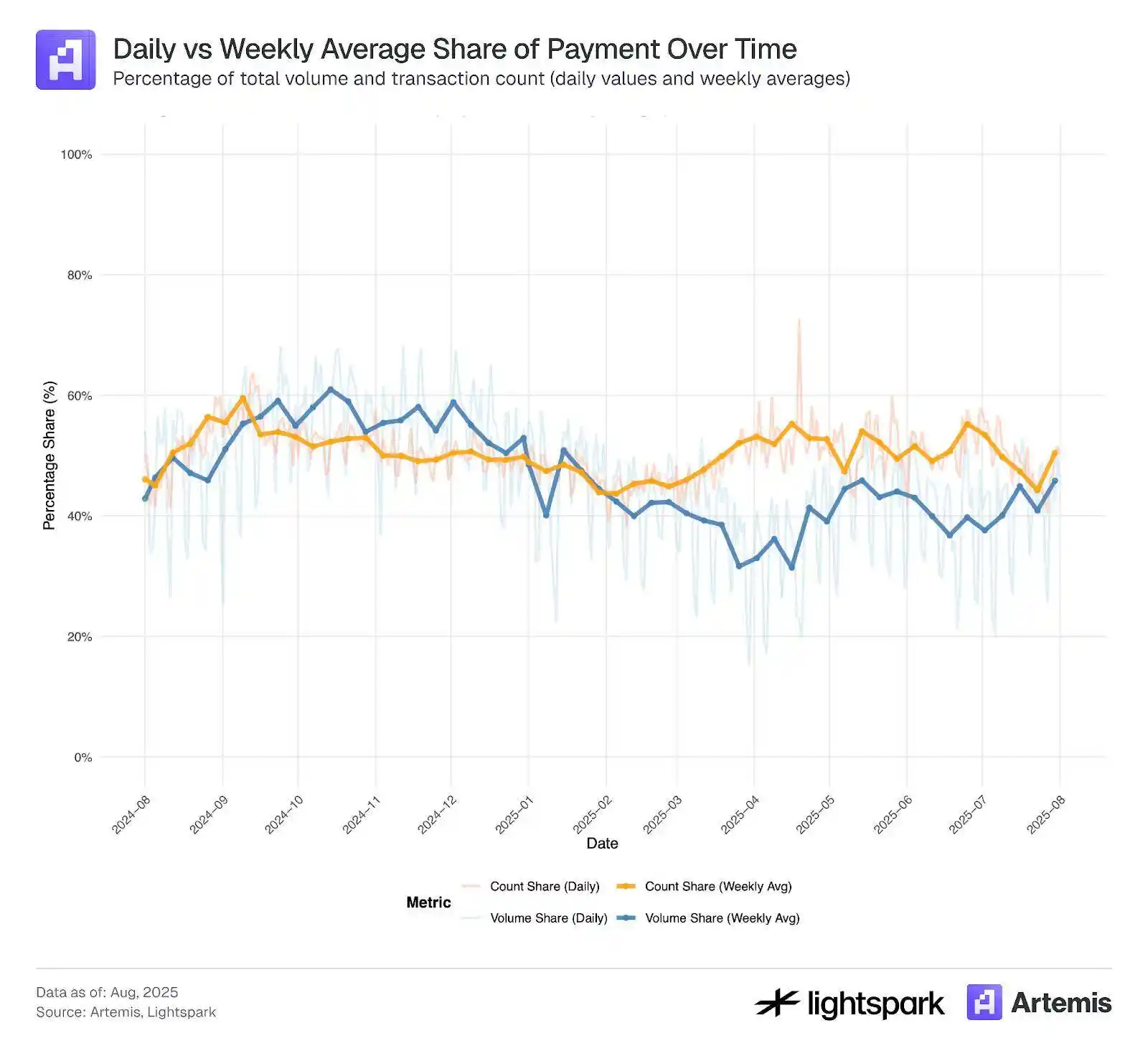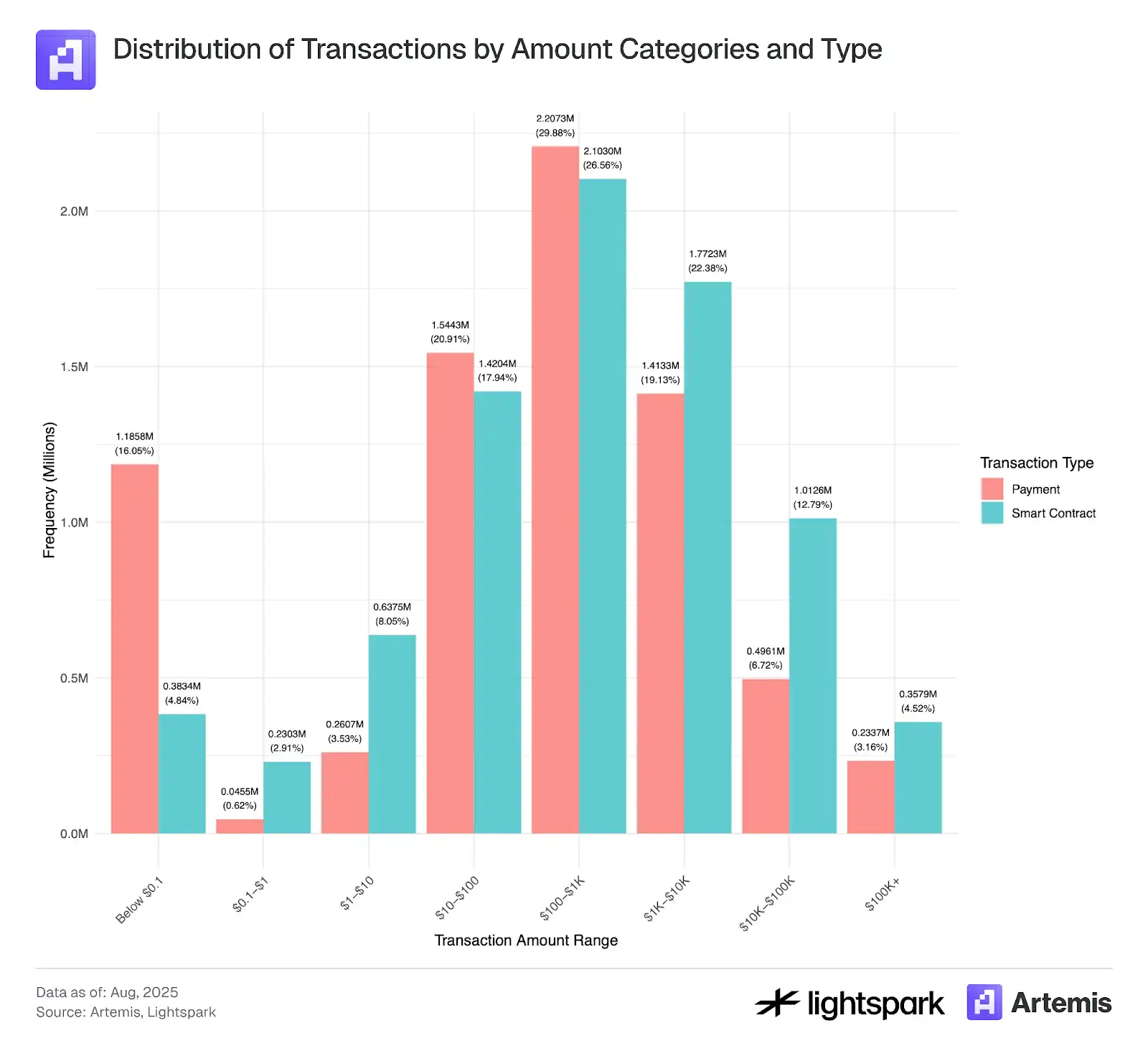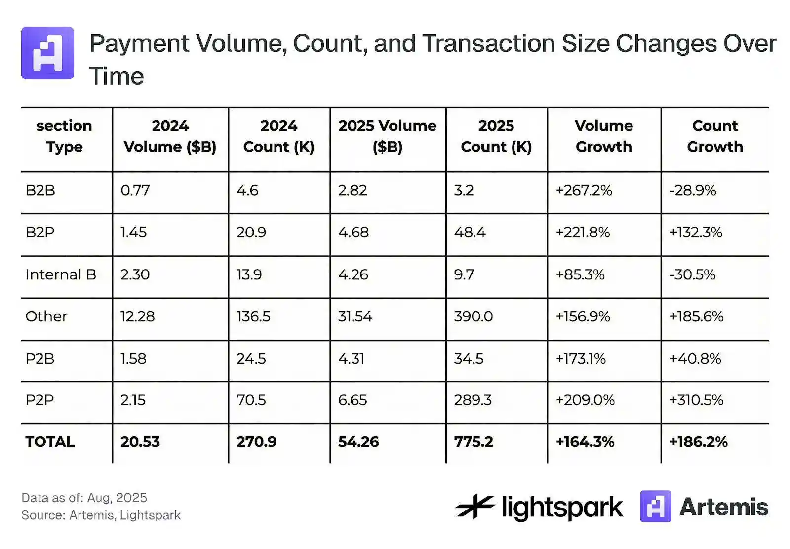 Rõ ràng, tỷ lệ chấp nhận stablecoin đang không ngừng tăng lên theo thời gian, với khối lượng giao dịch và số lần giao dịch tăng hơn gấp đôi từ tháng 8 năm 2024 đến tháng 8 năm 2025. Việc ước tính sử dụng stablecoin trong thanh toán là một nhiệm vụ đầy thách thức, và ngày càng có nhiều công cụ được phát triển để giúp cải thiện ước tính này. Nghiên cứu này sử dụng dữ liệu nhãn do Artemis cung cấp để khám phá và ước tính việc sử dụng stablecoin cho thanh toán được ghi lại trên blockchain (Ethereum).
