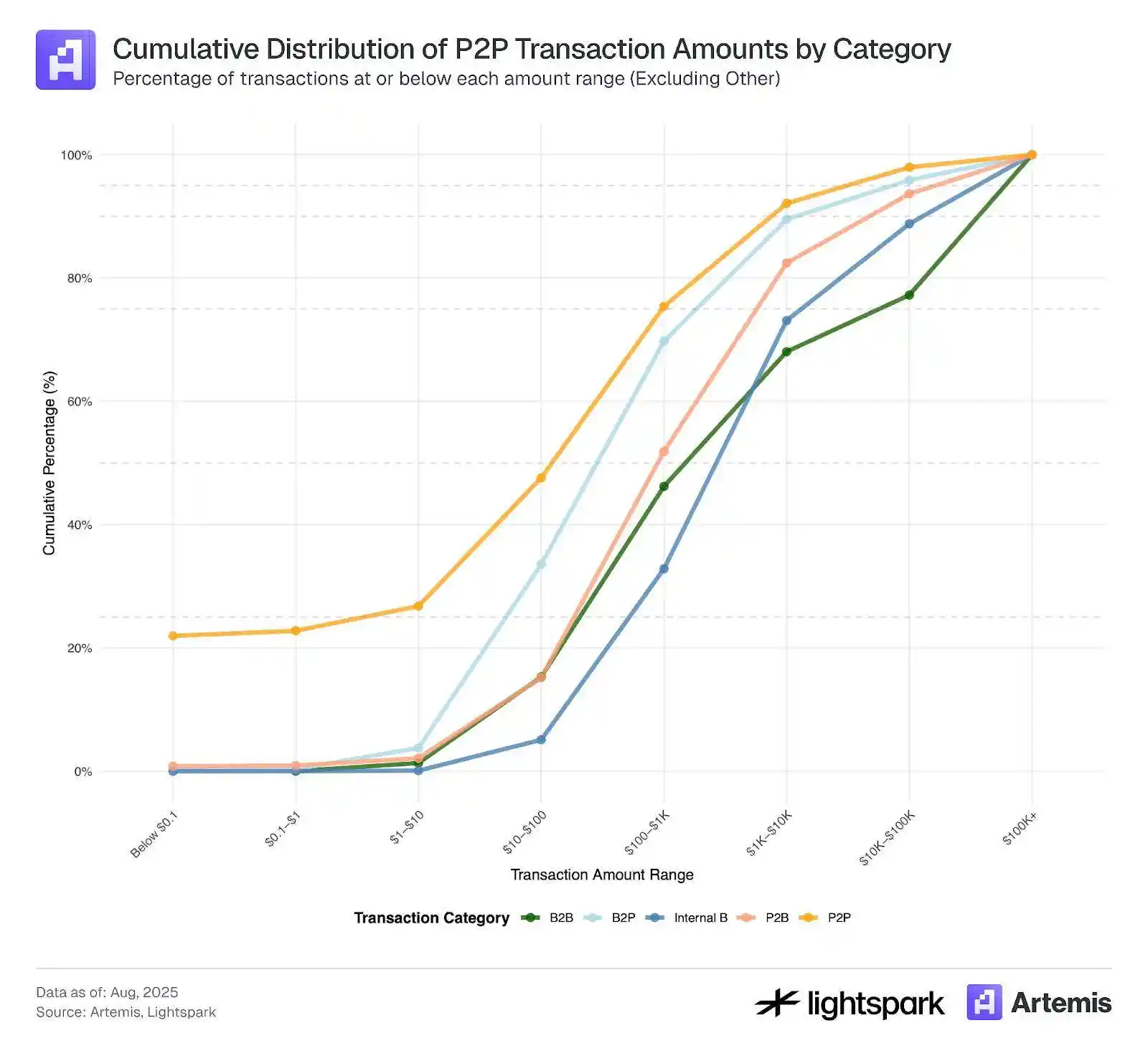 Trong Mục 3.2, bằng cách sử dụng thêm dữ liệu nhãn Artemis để phân loại thêm các giao dịch thanh toán thành P2P, B2B, P2B, B2P và Nội bộ B, chúng tôi thấy rằng thanh toán P2P chỉ chiếm 23,7% tổng khối lượng giao dịch thanh toán (tất cả dữ liệu thô) hoặc 11,3% (không bao gồm giao dịch Nội bộ B). Nghiên cứu trước đây đã chỉ ra rằng thanh toán P2P chiếm khoảng 25% thanh toán bằng stablecoin, kết quả của chúng tôi tương đối gần với con số đó.